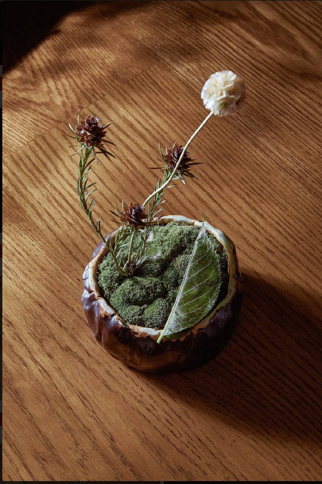 We currently have a fig dish on the menu. We basically hollow out a fig and stuff it with cake and a cream filled with fig leaves, and then close it again with the interior flesh that we hollowed out, so at this point, you have something that looks just like half a fig. We top it off with a fig wood ice cream. We just basically use every single thing that comes out of the tree to create a dish. Most of the ideas come very randomly to me in my head; we don’t really try to force anything by sitting down and discussing new dishes with the team. Whenever the idea is there, we just try it.