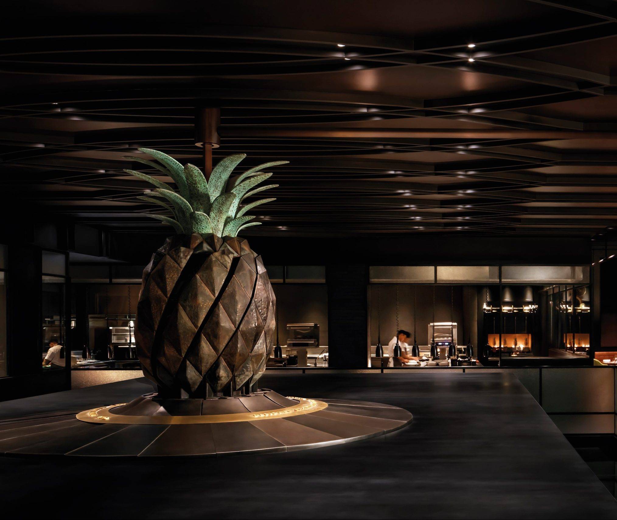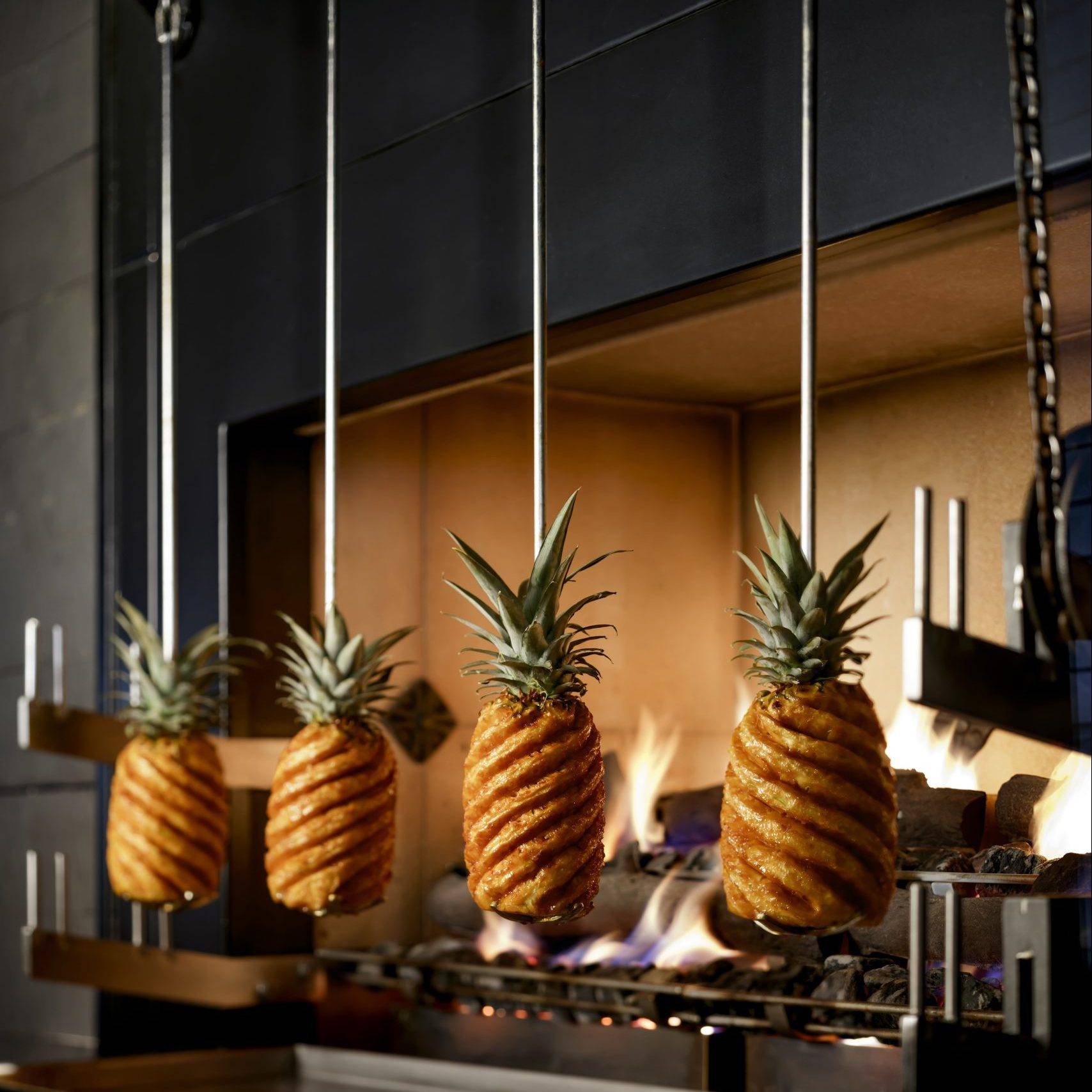 “The most notable part of the design greets guests upon entry and takes the form of a pineapple rotisserie and ‘The Dinner Escapement’ (clock). Designed as a breathtaking spectacle, this installation also adds a unique layer of history and storytelling to one of our signature dishes, the Tipsy Cake. Featuring a pulley system based on a sixteenth-century design used for the British Royal Court, the two-metre-high clock is inspired by the watchmakers of Greenwich and the royal kitchen of Tudor England, and the system powers a clockwork spit roast located in the kitchen that cooks the pineapples.