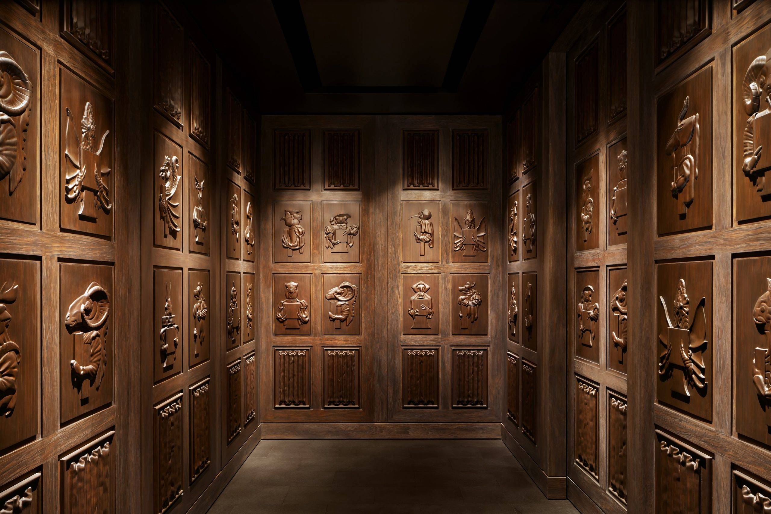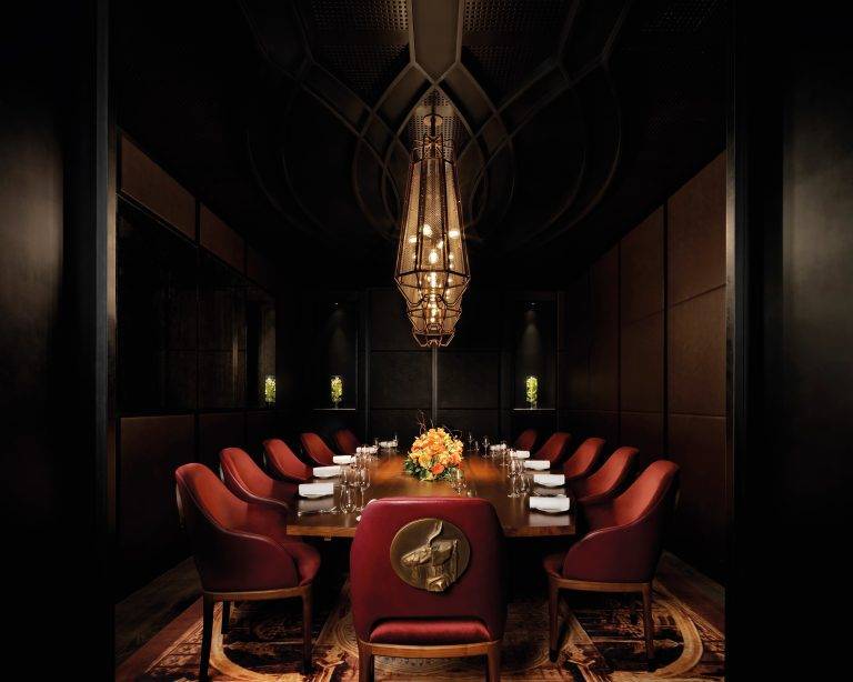 “Located on the second floor of Atlantis The Royal, Dinner overlooks the stunning Skyblaze fountain via an expansive terrace and floor-to ceiling windows. Guests enter the restaurant through a panelled room, perfumed with frankincense, wood smoke and leather, and featuring Victorian-style animal sculptures built into the wood. As the entry door closes, a concealed automatic sliding door opens to reveal the dining area and show kitchen.