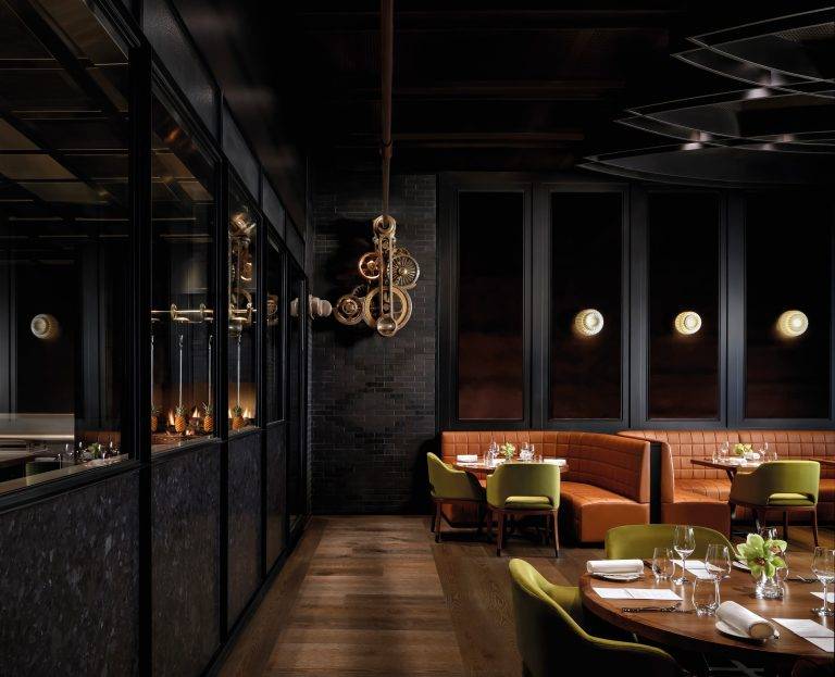Awash with shades of black, brown and green, and featuring a spit-roast pulley system inspired by the sixteenth-century British Royal Court, the interior of Dinner by Heston Blumenthal Dubai serves as the perfect backdrop for an awe-inspiring dining experience © Brandon Barré