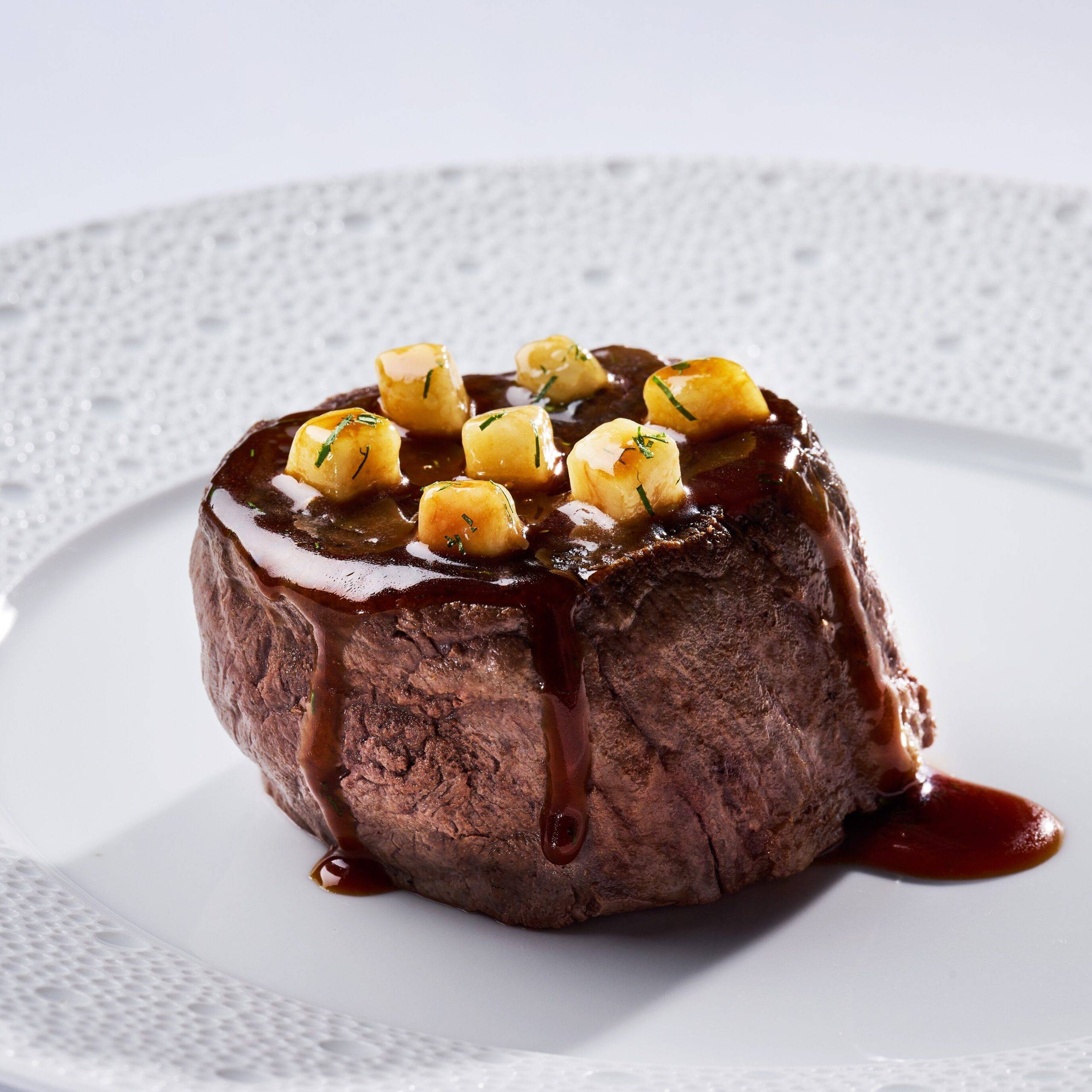 The dining room of Heston Blumenthal Dubai offers beautiful views of the city © Brandon Barré; Fillet of Wagyu Beef (circa 1830) served with rich bone marrow sauce and mushroom ketchup © Kerzner International Ltd.; Cider Gimlet © Kerzner International Ltd.; Cod in Cider (circa 1940), with chard, onions, mussels and smoked artichokes © Kerzner International Ltd.