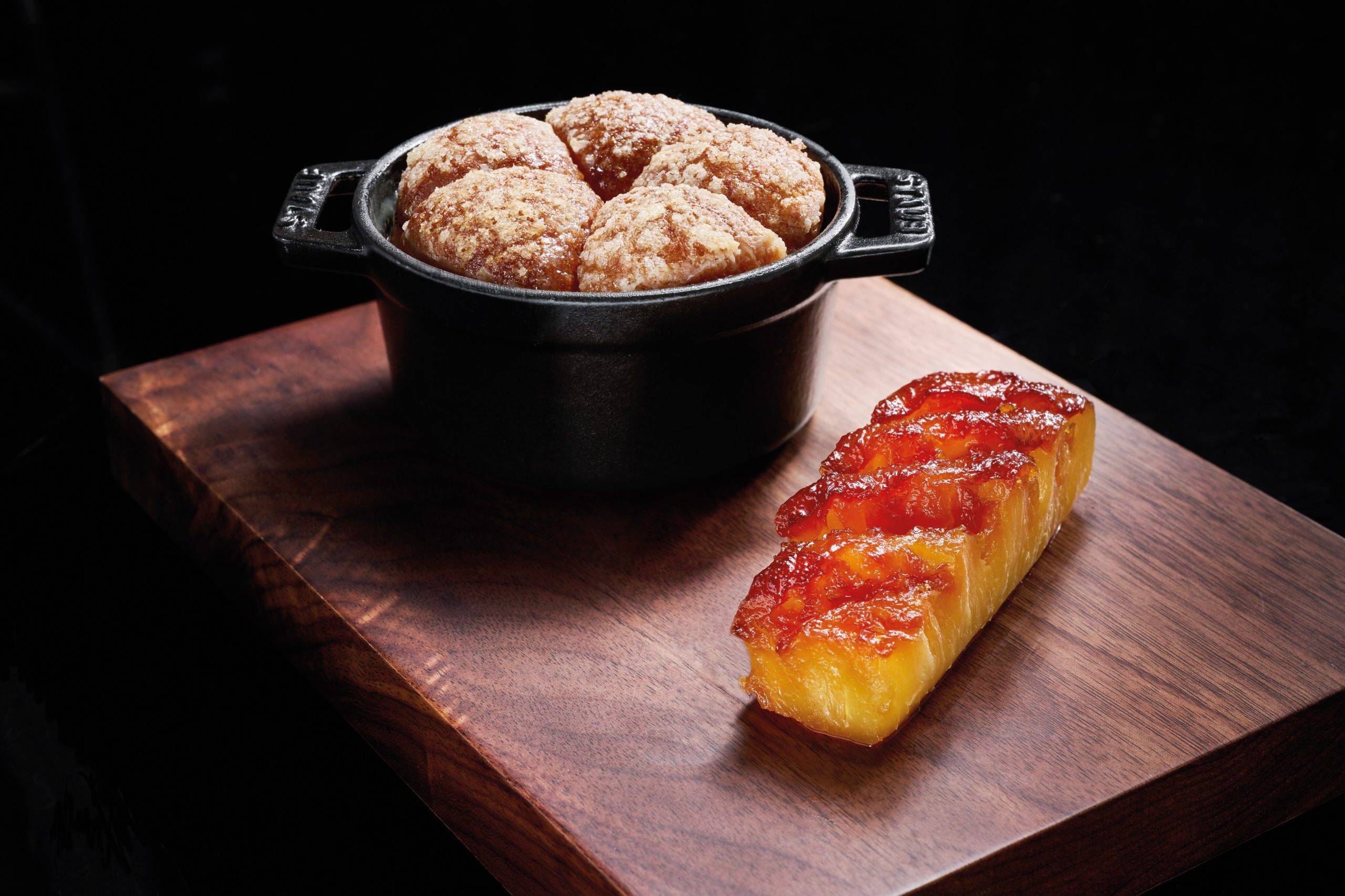 “After a historical journey of sampling rich mains, guests can go on a sweet discovery of the nineteenth century with the very popular dessert, Tipsy Cake (circa 1858). Taking his lead from the arrival of the first pineapples to the English court in the 1600s, Heston devised a featherlight brioche cake that has been lightly basted in Sauternes wine. It is served with slices of roasted pineapple that have been slowly roasted on a spit for up to six hours.