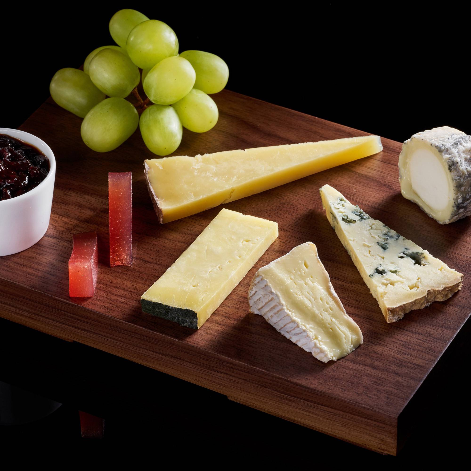 Clockwise from top-left: selection of British cheeses served at Dinner by Heston Blumenthal Dubai; Hay Smoked Salmon (circa 1730); the signature Tipsy Cake (circa 1858) featuring a custard-soaked brioche served with golden spit-roasted pineapple; Salamagundy (circa 1723) © Kerzner International Ltd.