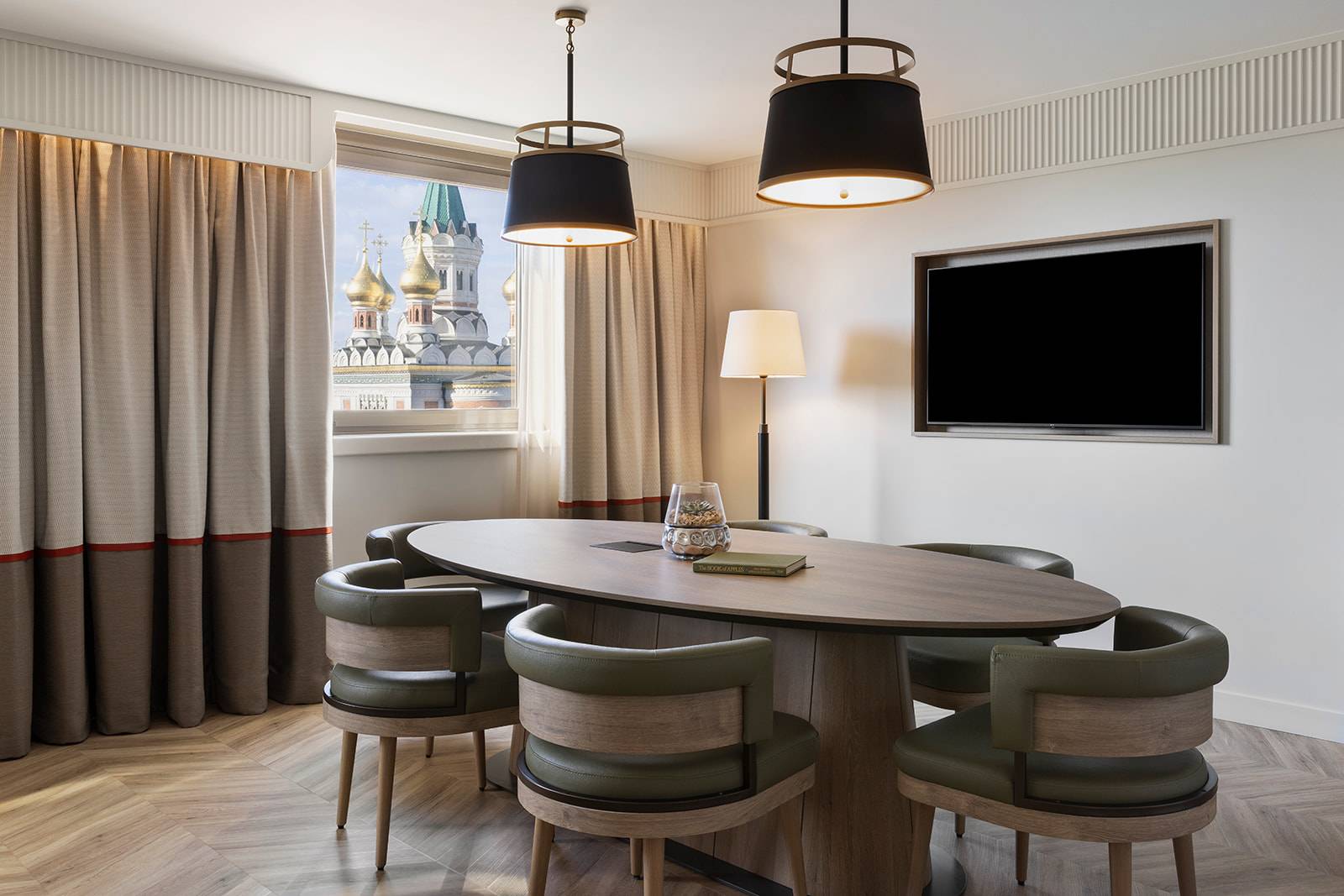 Look closer, and you’ll find the equestrian theme subtly incorporated throughout the guest spaces: the corridors are carpeted with patterns that suggest dressage hooves, and the rooms feature woven leather accents, horsehair panels, wooden finishes, and soft, impressionistic watercolour details. Calm and comfortable, the rooms are generous by city standards, with clear layouts and modern bathrooms stocked with products from Vienna’s Saint Charles Apothecary. Many look out across the garden or towards the neighbouring Russian Orthodox Cathedral, keeping a sense of place firmly in view.
