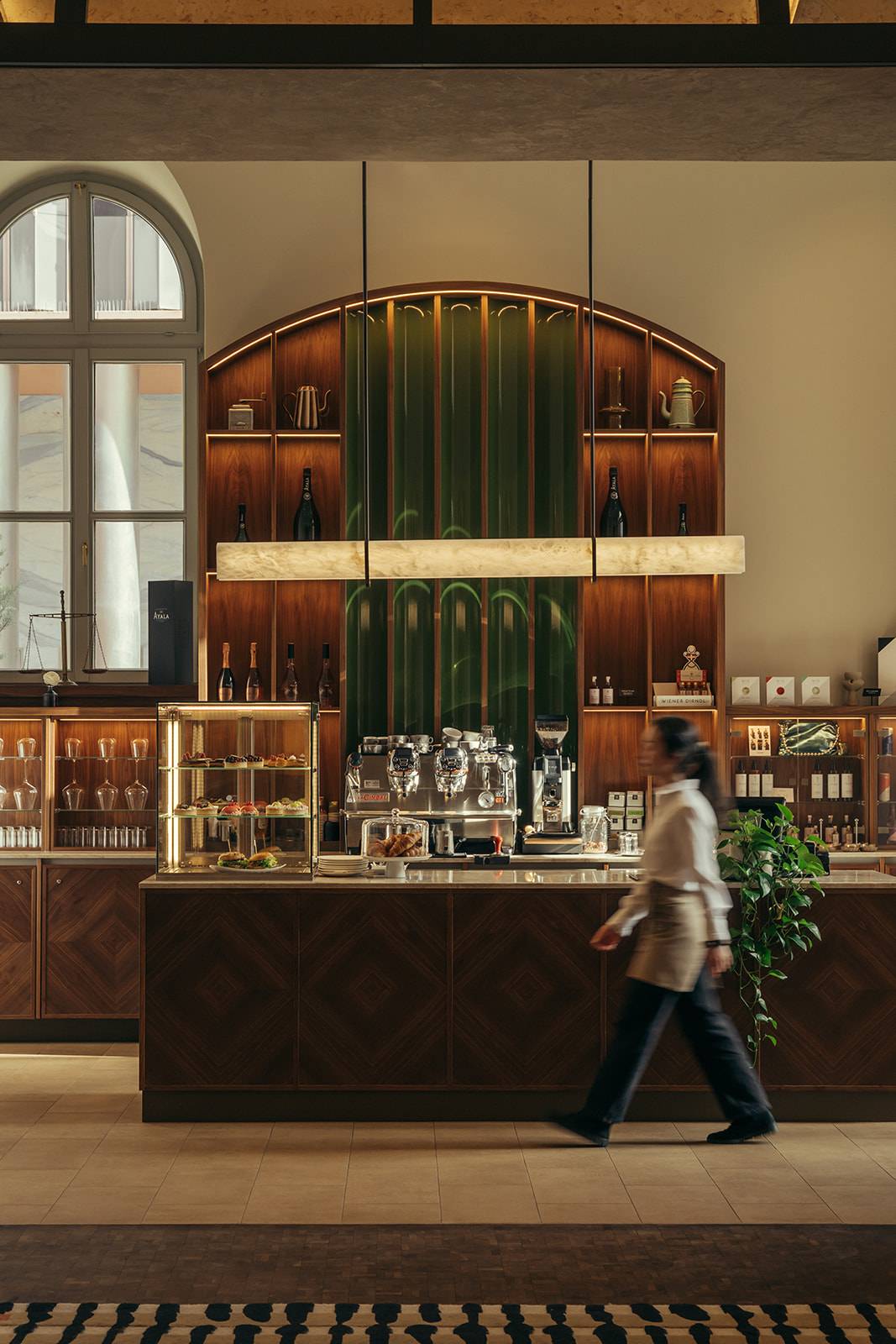 Next door, The Farrier, set in the former riding hall, shifts mood as the day changes: coffeehouse from sunrise to sunset, then a classic cocktail bar in the evening. It’s the kind of place designed for an early aperitif that easily turns into “one more”, with cocktails that keep things playful—Fresh and Cloudy (ginger-lemongrass infused vodka, elderberry, apple juice, lemon) or the Pferdebändiger (“Horse Tamer”) with Reisetbauer gin, grapefruit juice, Ramazzotti Rosato and peach. There’s proper bar food too, from sourdough lángos with rotating toppings to a beef burger with apple and onion chutney, plus a vegan “Green Equerry” version built around sweet potato and lentils. And for something quick on the way out, Cameo—a small takeaway spot near the S-Bahn route—stocks sweet and savoury snacks and gifts, a wink to the building’s cinema years (the name is a nod to cameo appearances in film and TV).