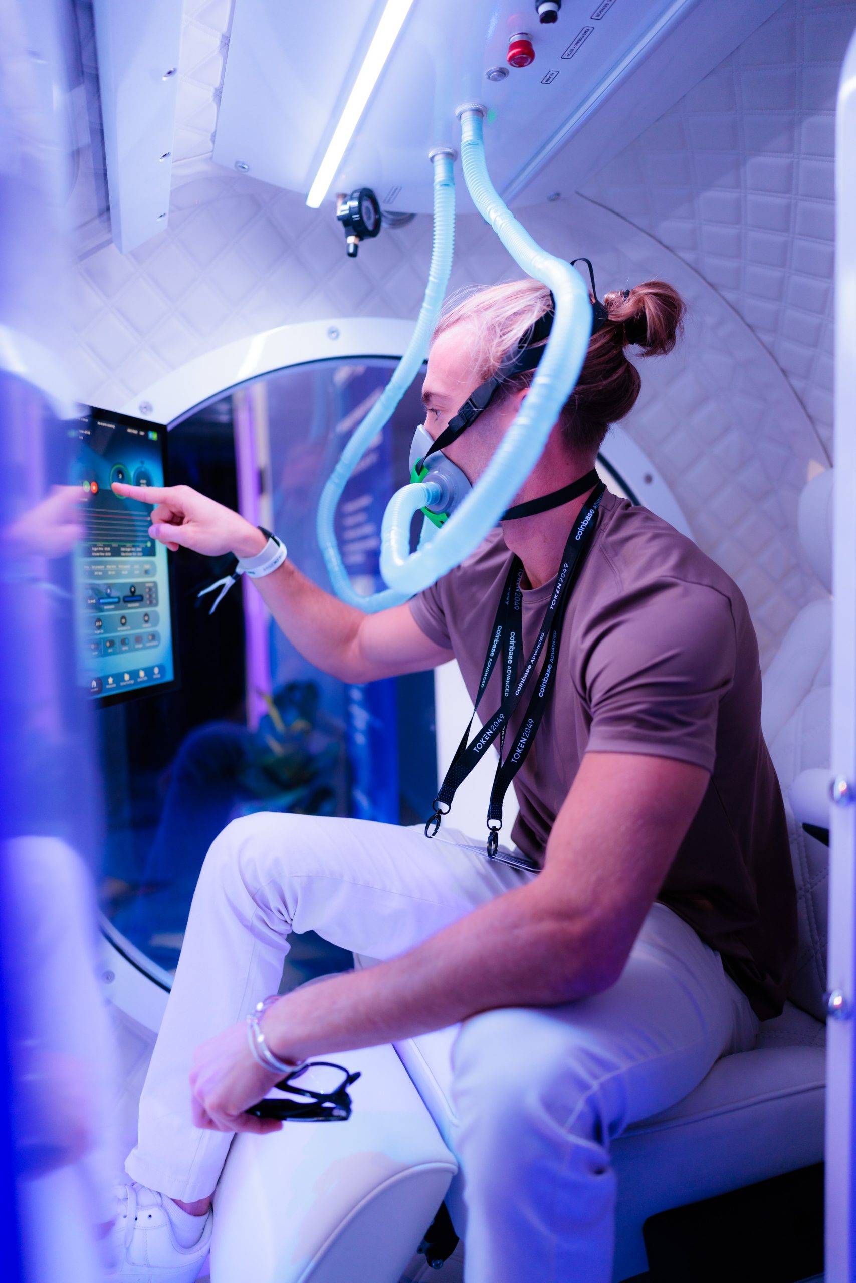 Above: Inside the ZEUGMA hyperbaric chamber, users are breathing pure oxygen on demand through the BIBS mask with CO2 exhaust.