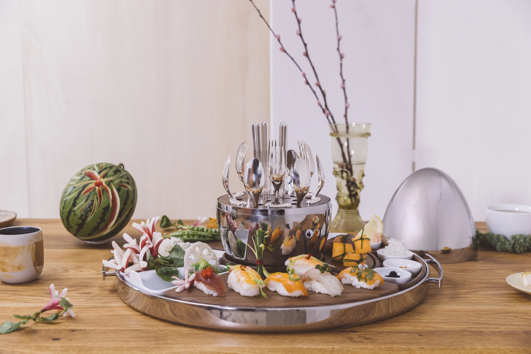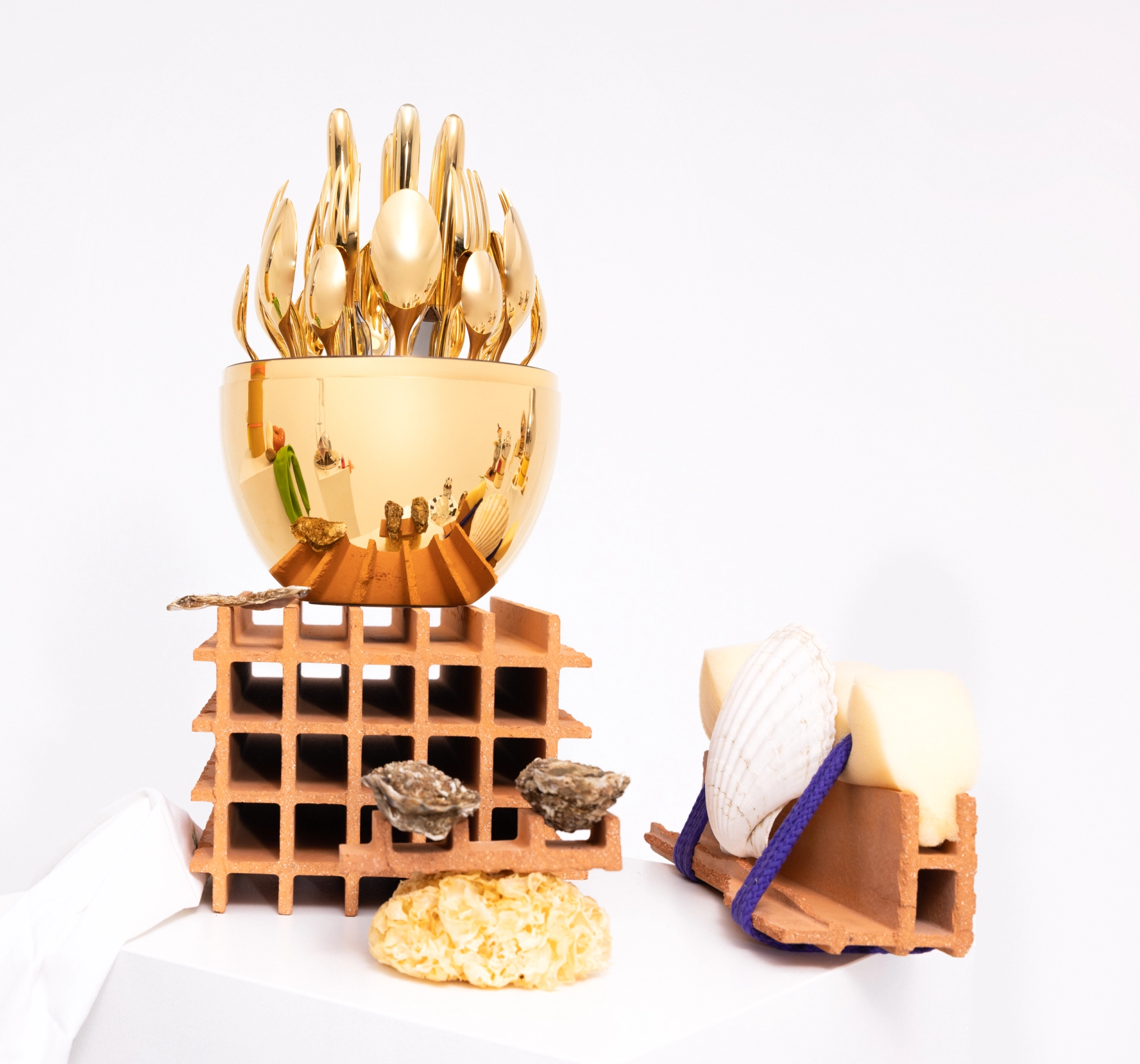 Initially launched in 2015, is comprised of 24 pieces for 6 people suited for all courses from starter to dessert. The vertically presented oviform silver-plated cutlery challenges traditional table settings conventions by acting as a centrepiece, an integral part of the dining experience, as each guest chooses has the freedom to choose their own cutlery.