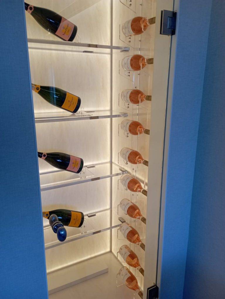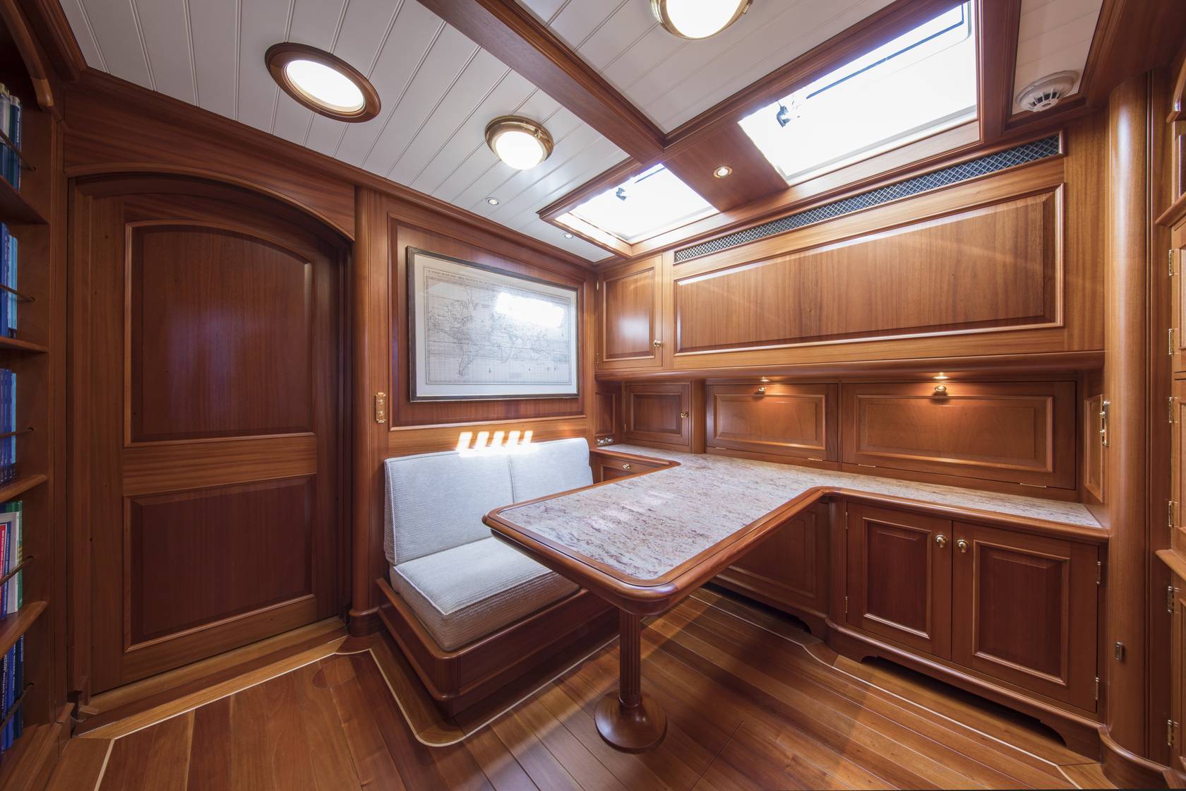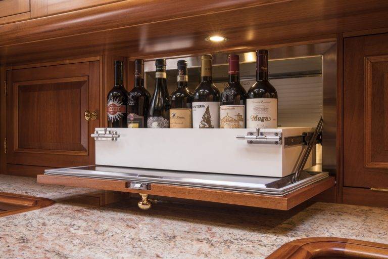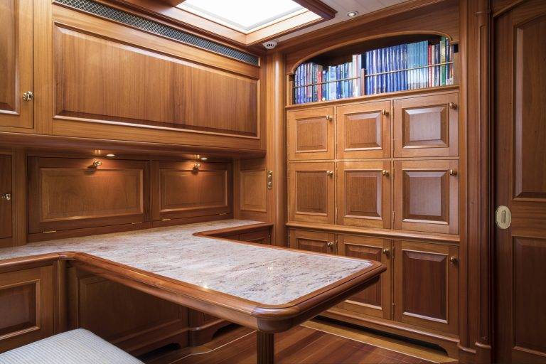 Another job I am proud of is an office modification we did on a modern classic sailing yacht from one of the most prestigious yacht builders in northern Europe. We needed to match a new table, shelves and two custom-made temperature-controlled wine drawers into some high-quality joinery. Looking at the photos, it’s very difficult to see where the original boat stops and our work begins. Just what I want to see.