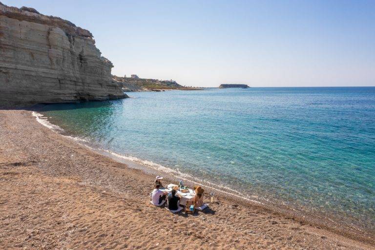 Clockwise from above left: exploring Avakas Gorge; picnic at White River Beach; excursion to Matrona Chruch; Champagne on the rocks at Maniki Beach