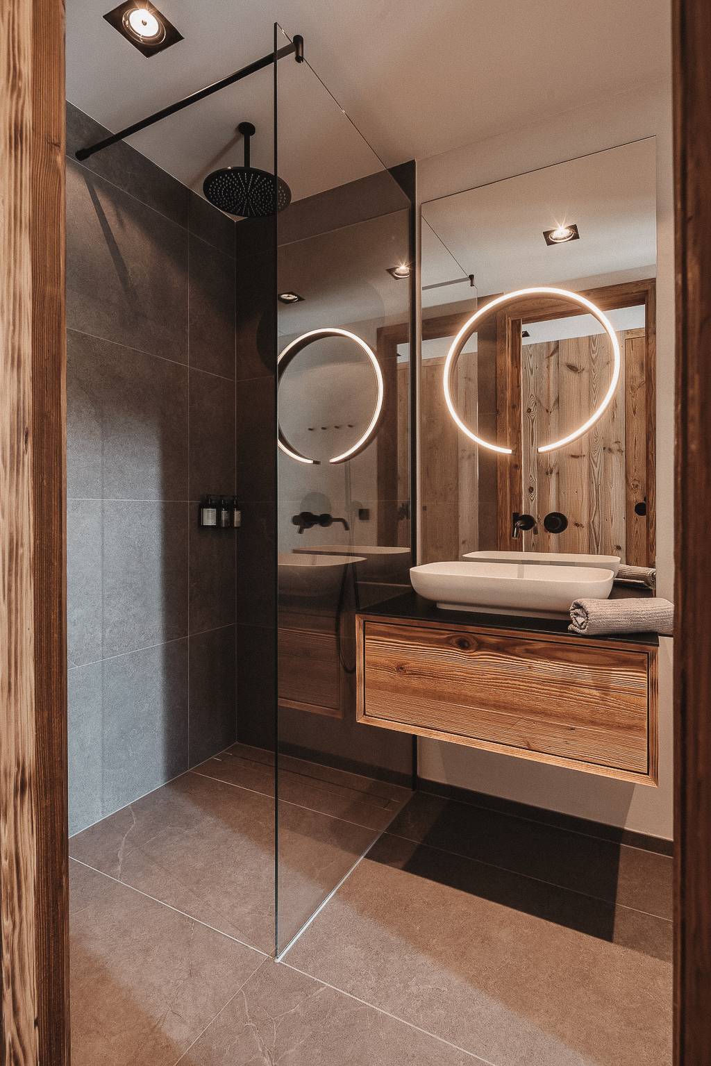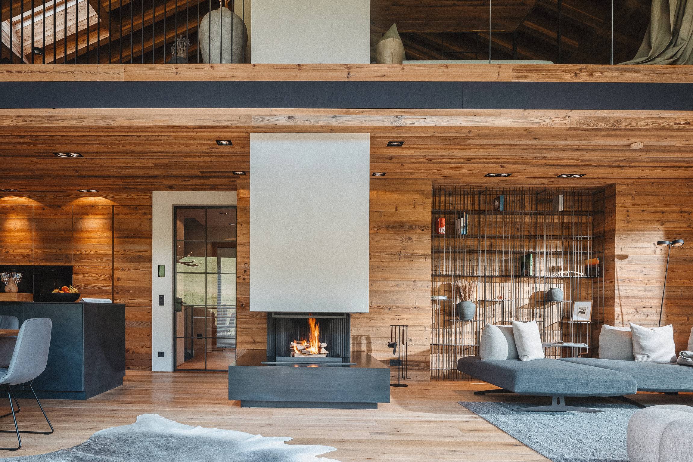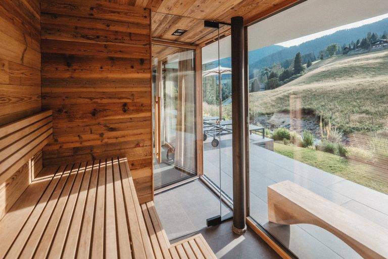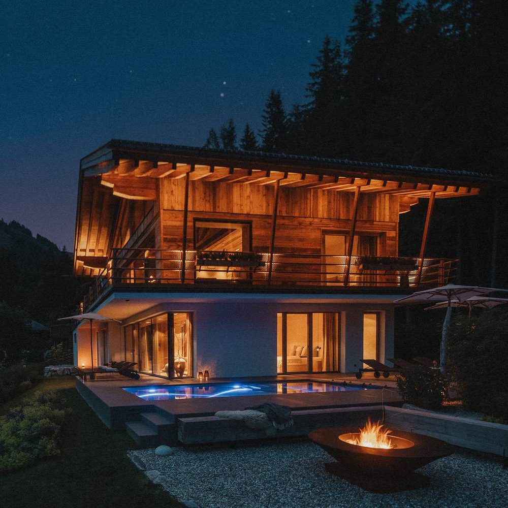 Outside, the landscaped garden flows into the forest and toward a quiet brook. Beyond it, a gentle Alpine meadow unfolds, dotted with grazing cows in summer. There’s a fire pit for star-lit evenings and unforgettable sundowners. And a private spa with a panoramic sauna and four ultra-comfy hanging loungers. The outdoor pool with integrated Jacuzzi is heated year-round to a soothing 32-33 °C—perfect after a day out in the mountains, or simply for doing nothing at all.