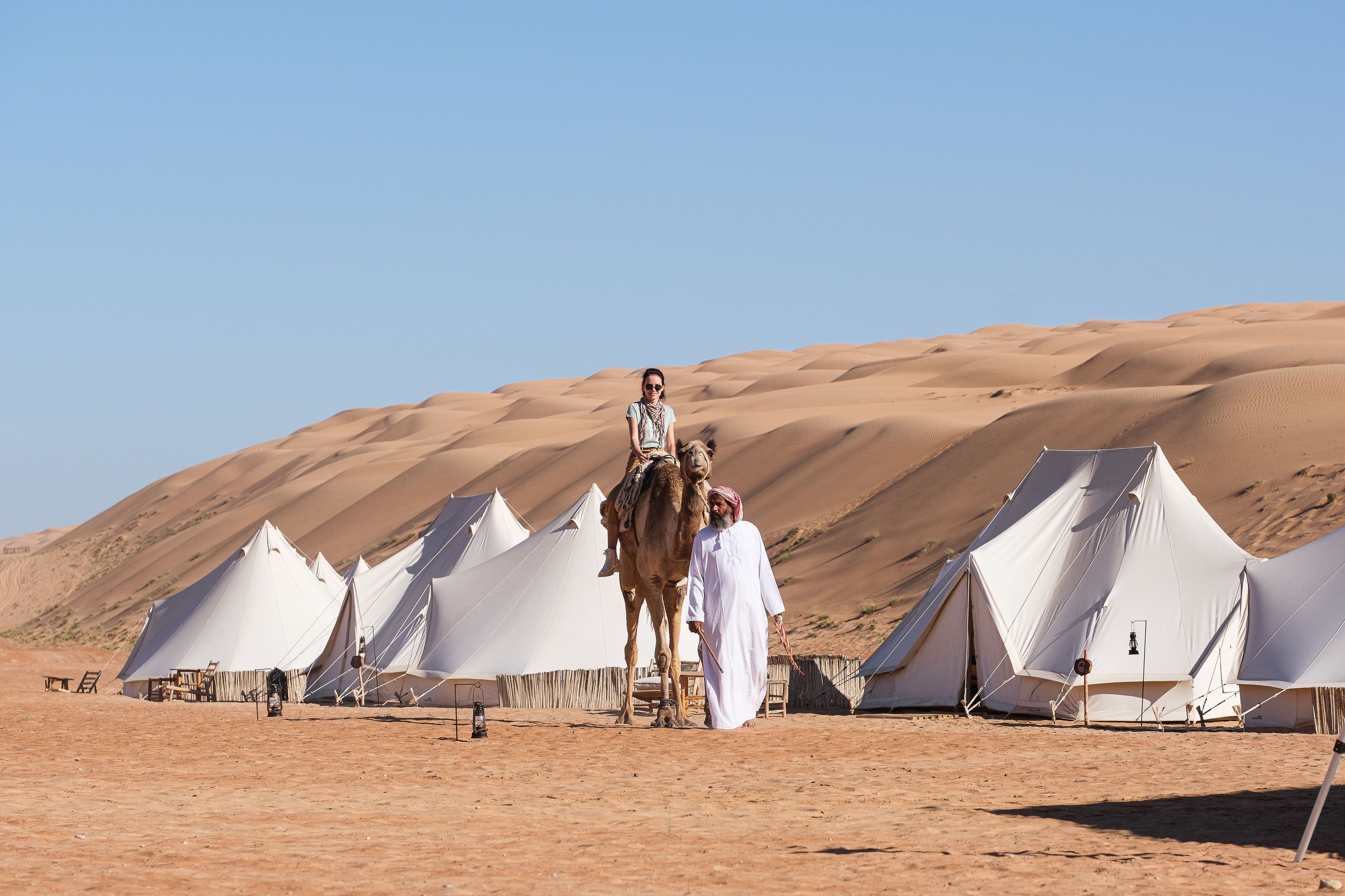 From May to September, the camps need to keep their doors closed, as the desert is stifling hot during summer. This desert camp caters to those who want to explore nature and live a unique experience in the most authentic way possible. The operation is very attentive and respectful of the environment. We do not use generators, we only use solar energy, we buy local food, and we use local resources and we try to be as sustainable as possible. Secondly, it is exclusive! Our Wahiba Sands camp has only 10 tents, which enable us to create an intimate atmosphere in the camp, and each bedroom tent has its own bathroom tent with private shower and toilets. The tents are made and furnished of natural materials fabric. The whole experience is built on being closer to the desert, and at the same time enjoying charming and refined surroundings.