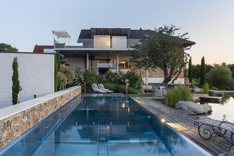 Golden Hill is a private hideaway in Southern Styria. Set in former stables, you will find a unique 300 sqm luxurious panorama loft exclusively for two, and the old Styrian farmhouse was converted into a 180 sqm romantic chalet for up to six guests. A successful blend of old and new with a Mediterranean feel. In June 2018, three 120sqm luxury chalets were realised in casual elegant country style, just like the loft, in solid wood construction. In June 2021, two more chalets, one with a 10x4m infinity pool, were opened. Each unique holiday home has its own private spa with a sauna cube and outdoor wellness bathtub, as well as its own architectural interior highlights, such as a 21.5-metre glass frontage, old wooden kitchen, open fireplace, copper bathtub, stone bathtub, own infinity natural swimming pond and whirlpool, as well as a brand new 12x3m infinity pool by the loft, a paddock for your own horse, and much more. A retreat for the soul with unique energy spots. All day in your bathrobe, breakfast whenever you want, wellness in complete privacy, plus, uniquely in Southern Styria, a 15,000sqm idyllic park with a 600sqm swimming oasis with cosy corners and an extra sauna and fitness cube, champagne lounge, barbecue area and a fire pit. All cubes are made from an upcycled container and are a unique selling point in the industry.
