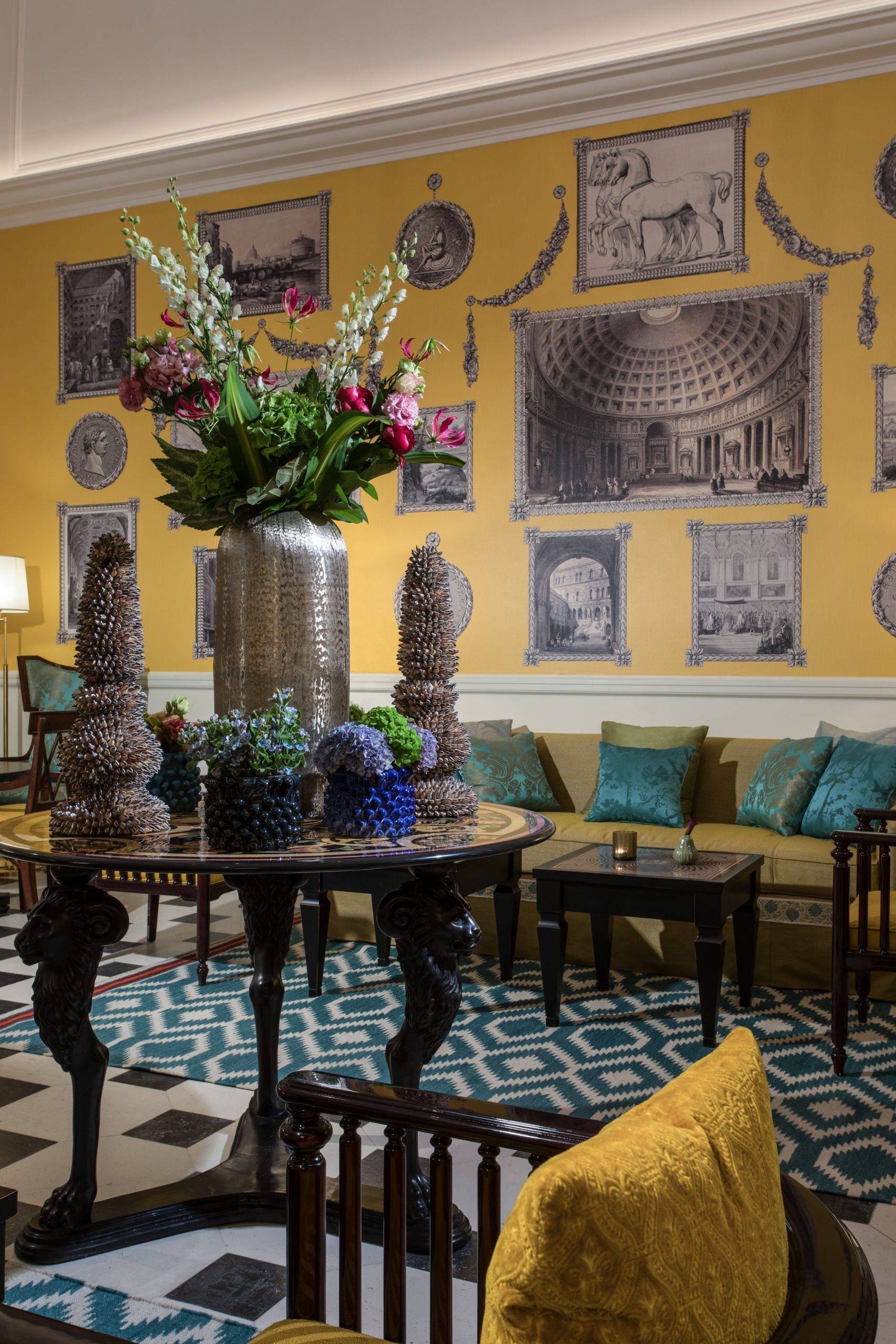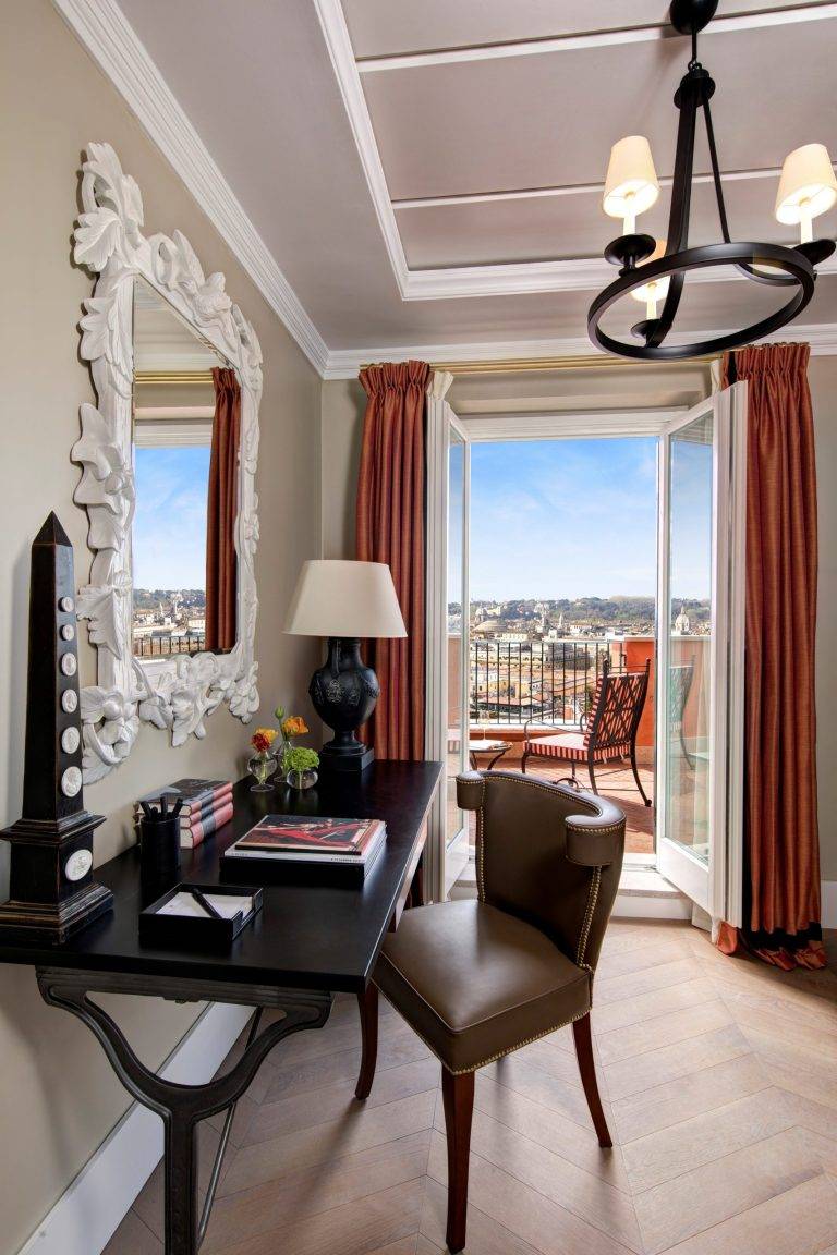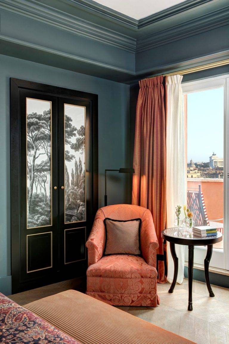 The design and interiors of Hotel de la Ville pay tribute to the Grand Tour era, capturing its essence through a curated collection of art and antique memorabilia. The building’s time-honoured heritage is celebrated with custom-designed wallpaper handcrafted by Rubelli and Dedar, vintage tapestries by Zardi & Zardi, and luxurious Italian fabrics that adorn the interiors. The inner courtyard, a secluded haven within the bustling city, features designs by George Carter inspired by 17th-century geometric garden layouts, creating a serene and romantic atmosphere.
