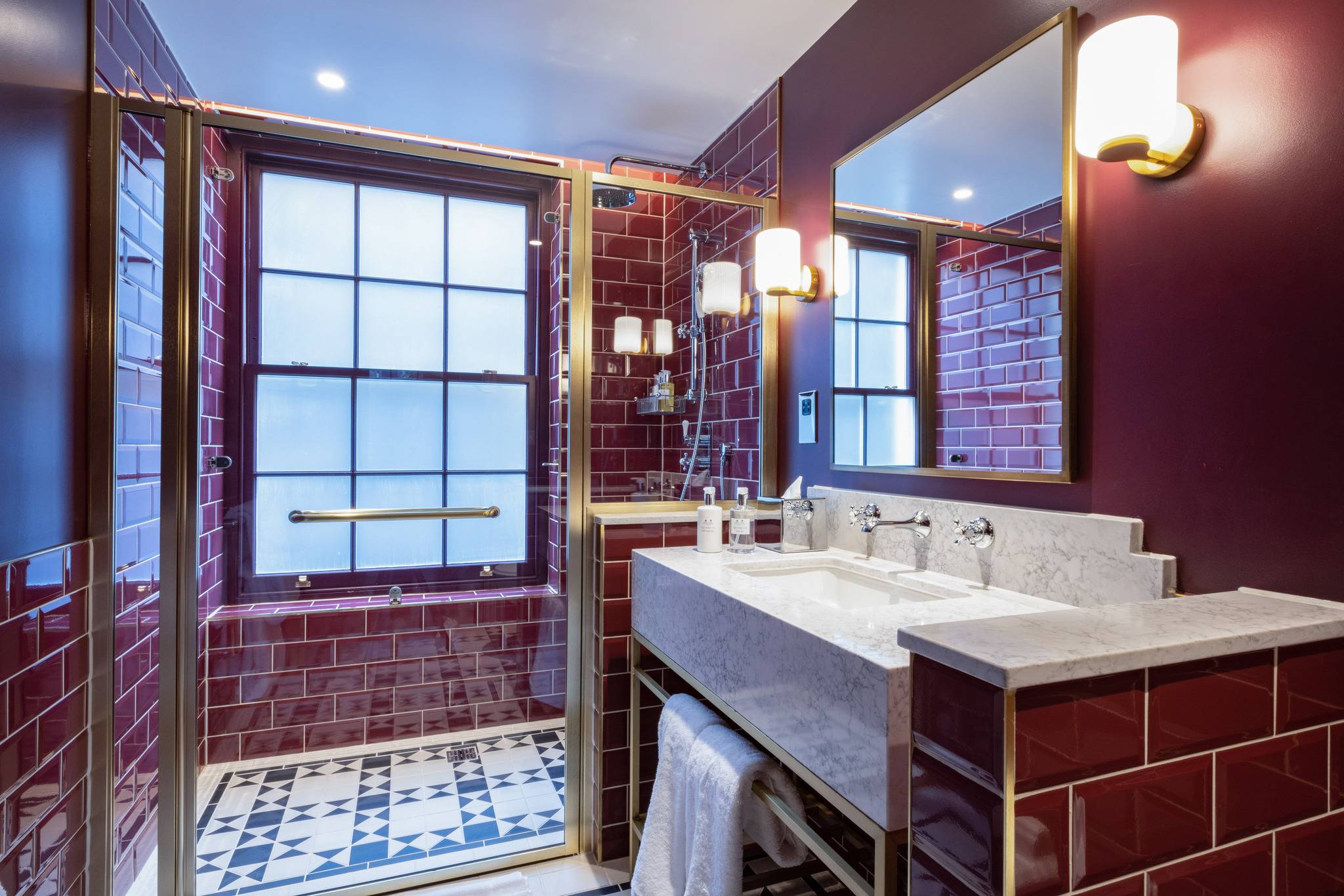 The enchanting journey carries on in the chambers. The Classic rooms in the original Georgian building brim with character, particularly the three Loft Suites on the fourth floor featuring exposed original brickwork and low angled ceilings. Window shutters provide privacy, while sumptuous period details come with an old-fashioned telephone, deep red walls, tapestry-style wallpaper, and area rugs. Bathing rituals feel more indulgent in the spacious bathroom featuring glazed red porcelain tiles, Belgravia taps and natural limestone walls.