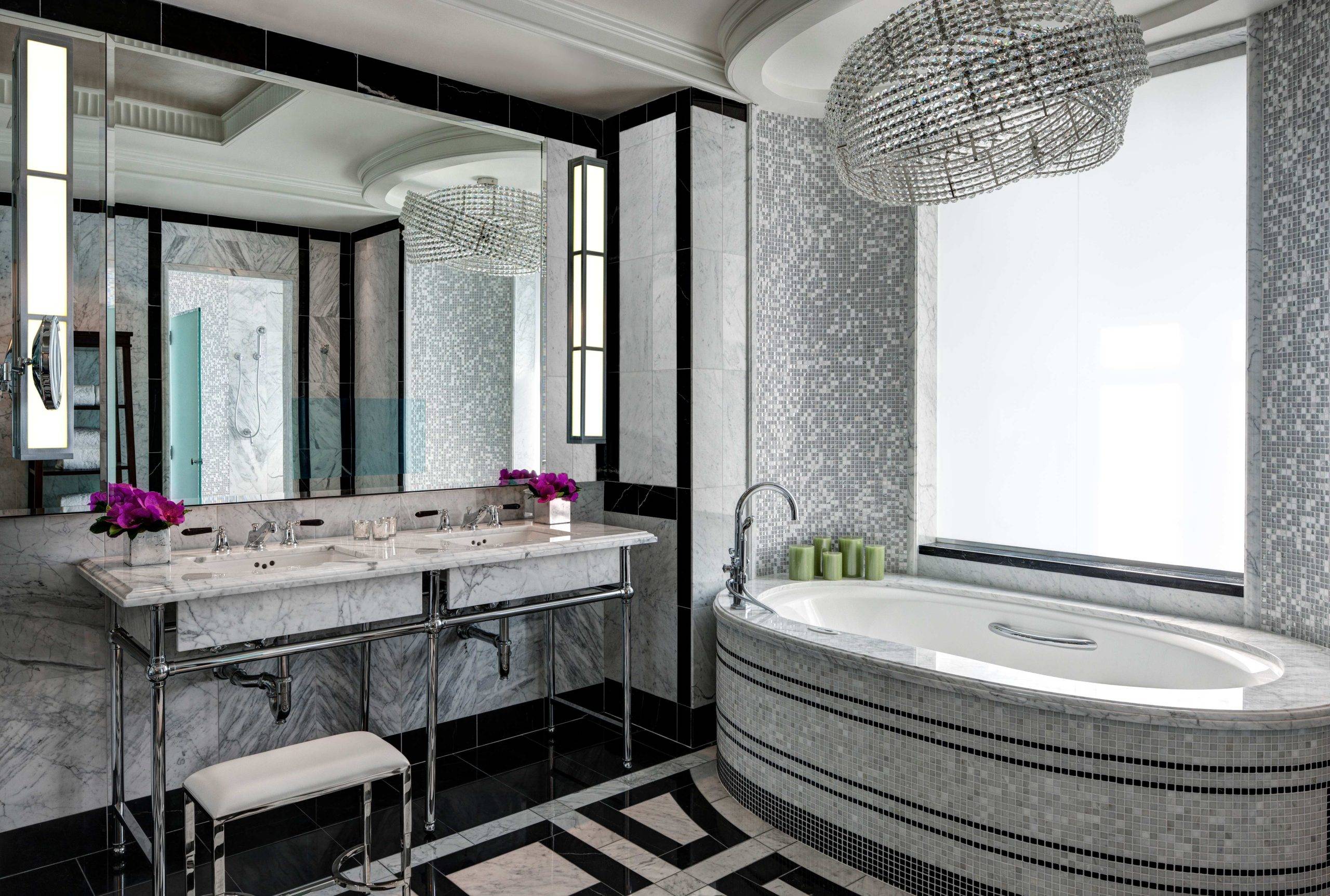 Clockwise from top-left: Fifth Avenue Suite bedroom; Presidential Suite bathroom; Imperial Suite living room; Bentley Suite dining room