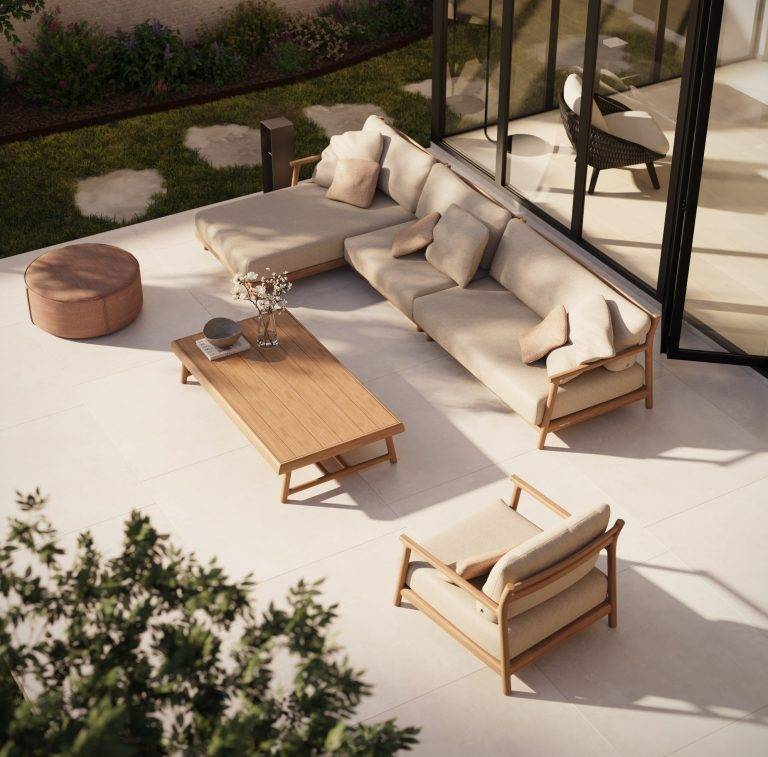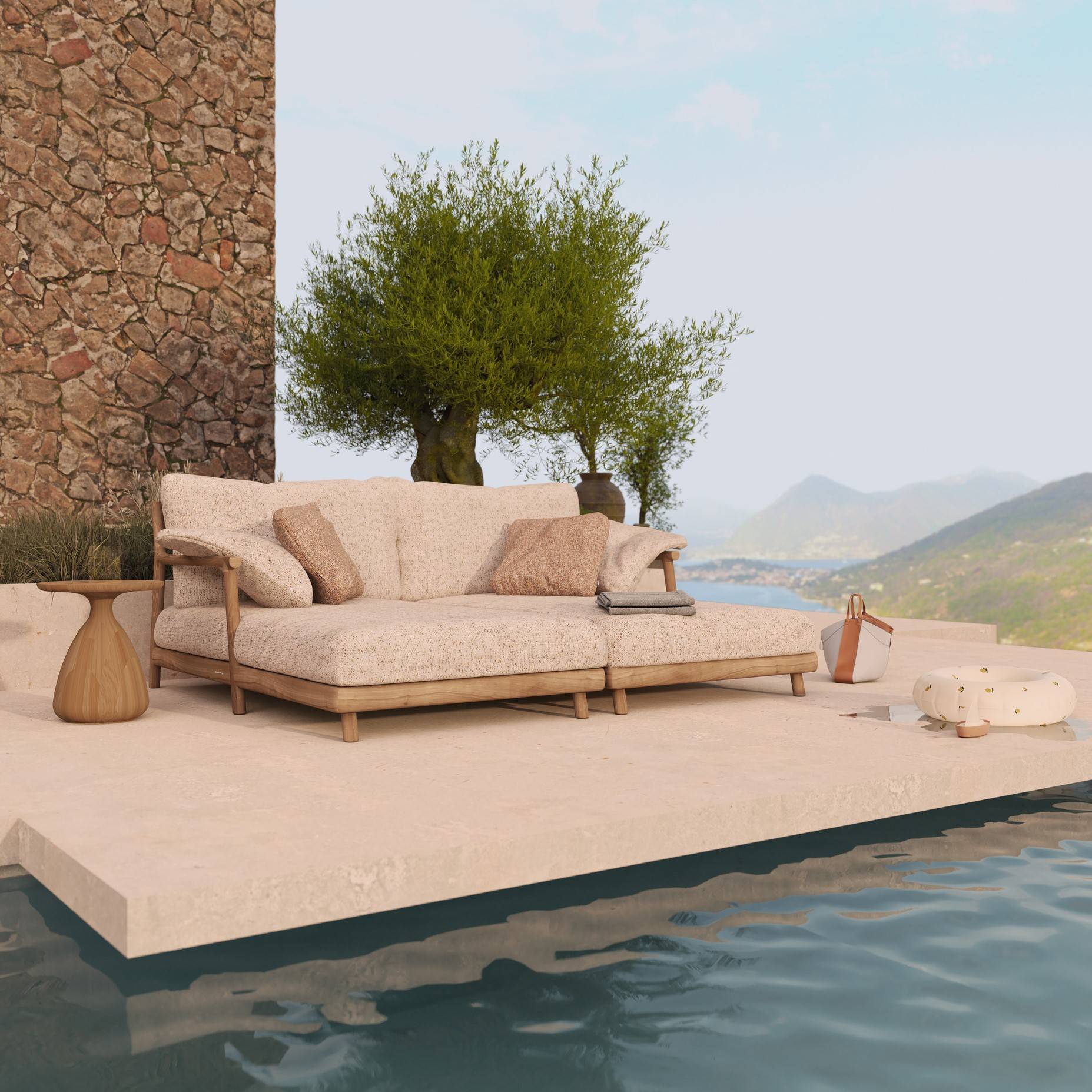 One of the standout features of the Muyu collection is its versatility. The sofa’s modular design allows for a high degree of customisation, enabling users to configure their furniture in ways that best suit their outdoor spaces and personal preferences. This is accompanied by large, fluffy cushions and pillows in opulent fabrics and textures that invite relaxation and convivial outdoor moments from sunrise to sunset. Expertly designed to withstand the harshness of wind, rain and sun, these cushions promise to maintain their plushness and appearance over time. Whether it’s a cosy corner for intimate gatherings or a sprawling lounge set up for larger parties, Muyu’s sofa sets adapt effortlessly to various needs and occasions. Even the medium footstool can be used as a coffee table, nesting into the larger coffee table or positioned between the seating elements, offering endless flexibility.