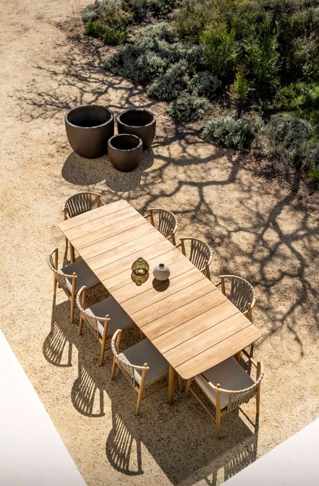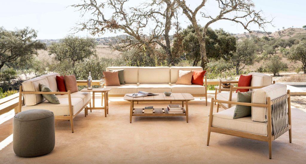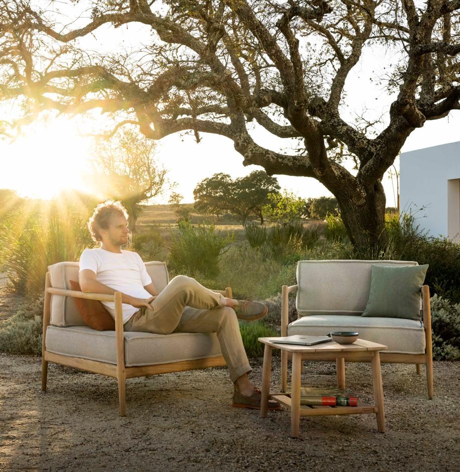 “Characterised by its curving, the framework is made of natural teak that pay homage to old craftsmanship. The feeling of being close to nature continues thanks to the handwoven strap with a subtle touch of green. The accompanying cushions of the lounge pieces are made with a maximum of comfort to fully enjoy your relaxation outdoors.”
