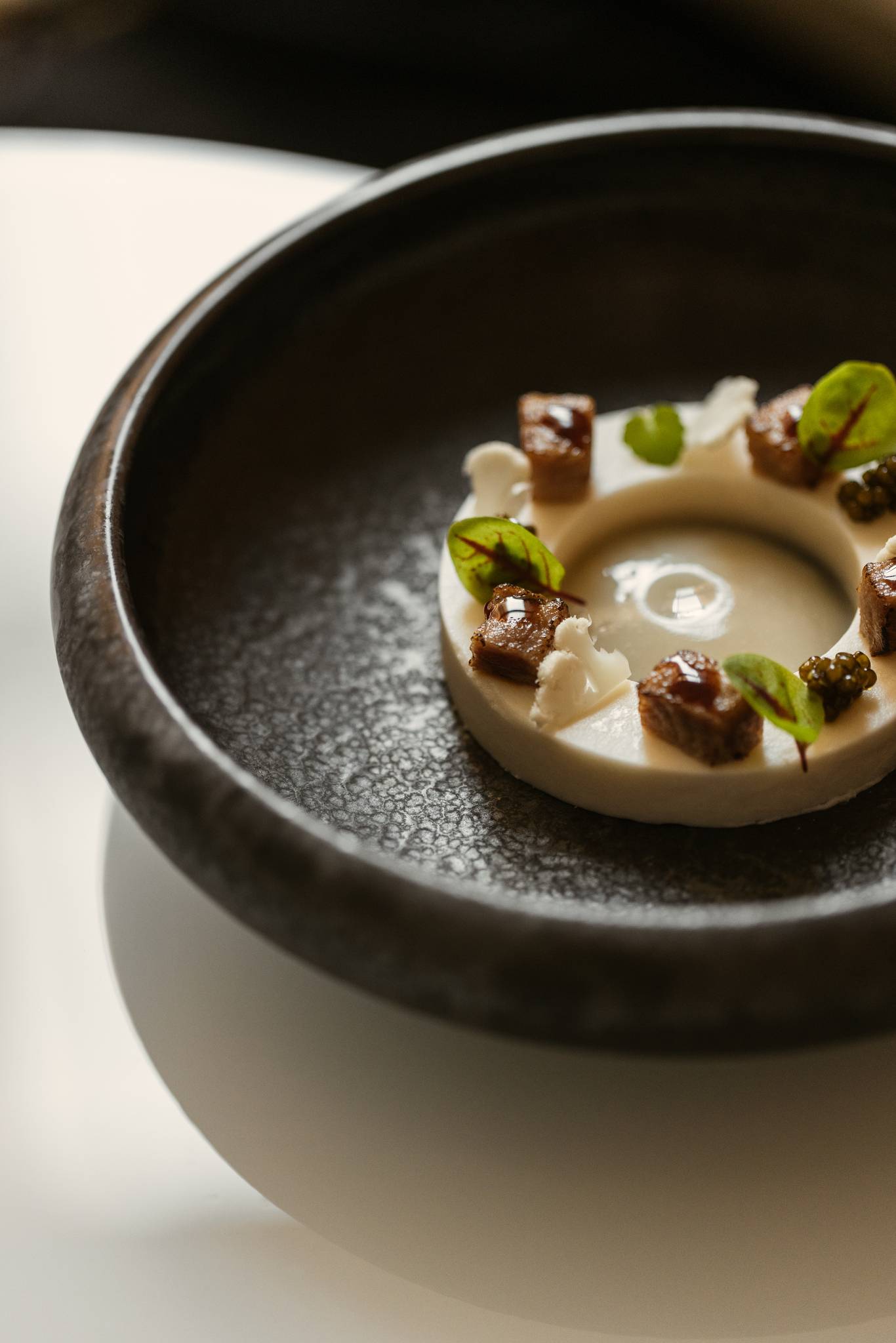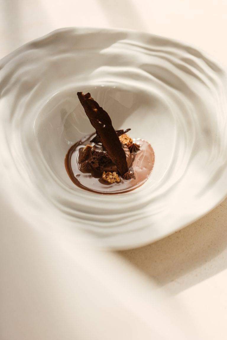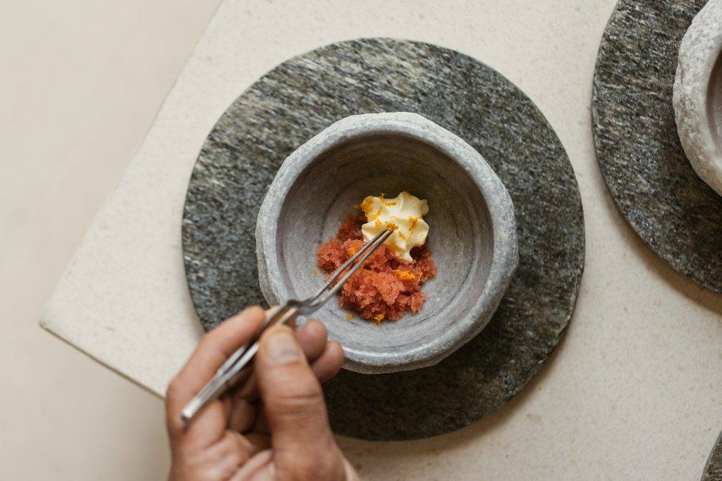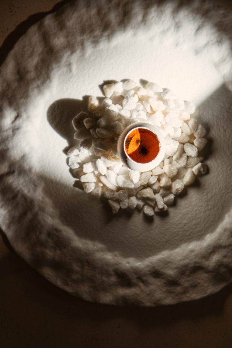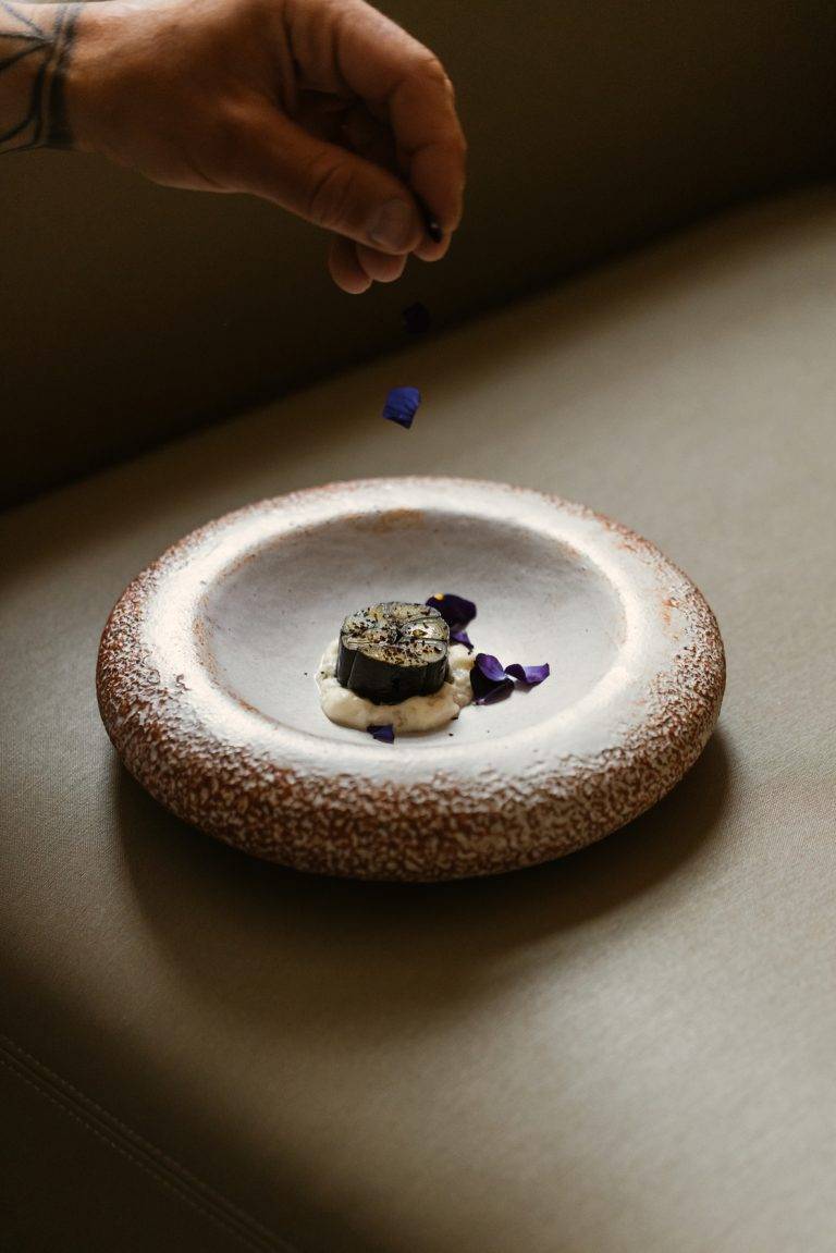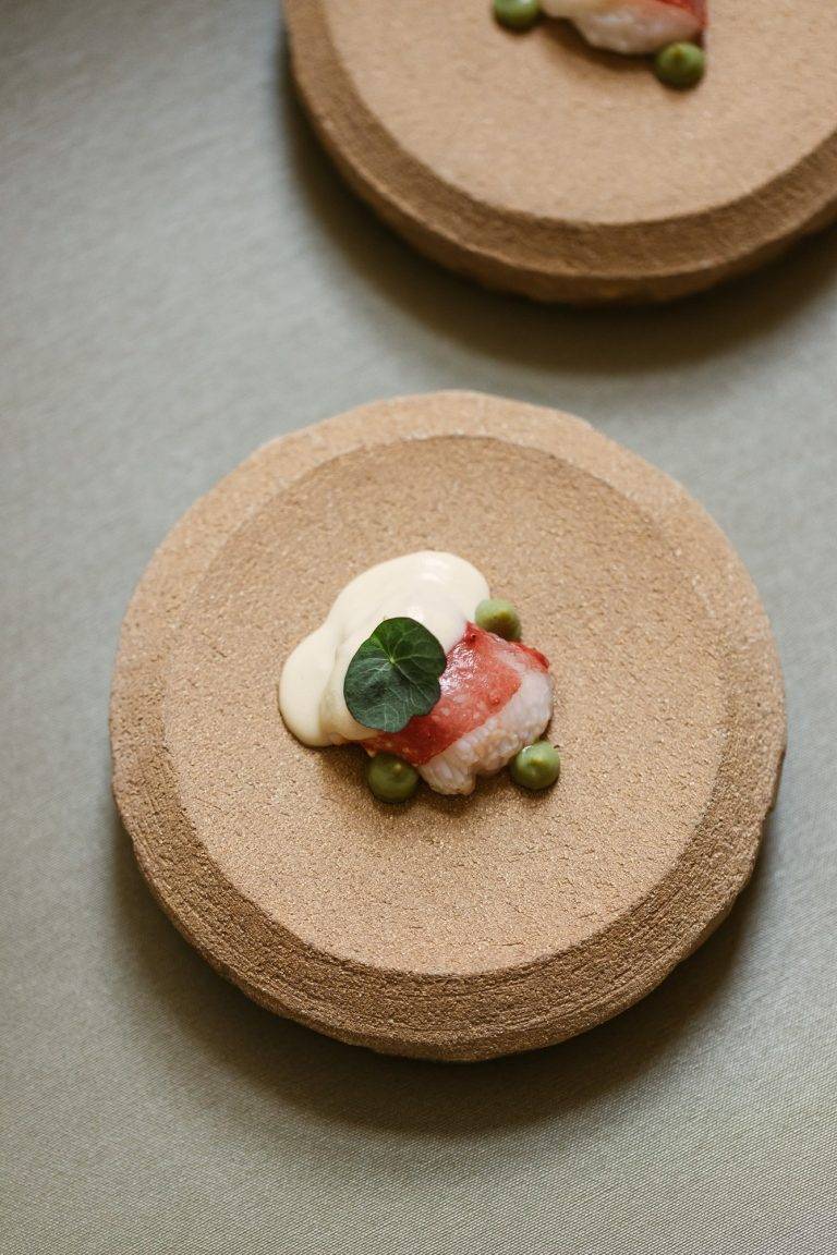 The restaurant’s interior is carefully curated to enhance the culinary experience with organic shapes, soft tones and natural materials creating a serene and inviting atmosphere. The presentation of each dish is a visual feast, with elegant plating that often incorporates edible flowers and ornaments, served on artisanal pottery. This meticulous attention to detail elevates each course, engaging all five senses and creating a lasting impression.