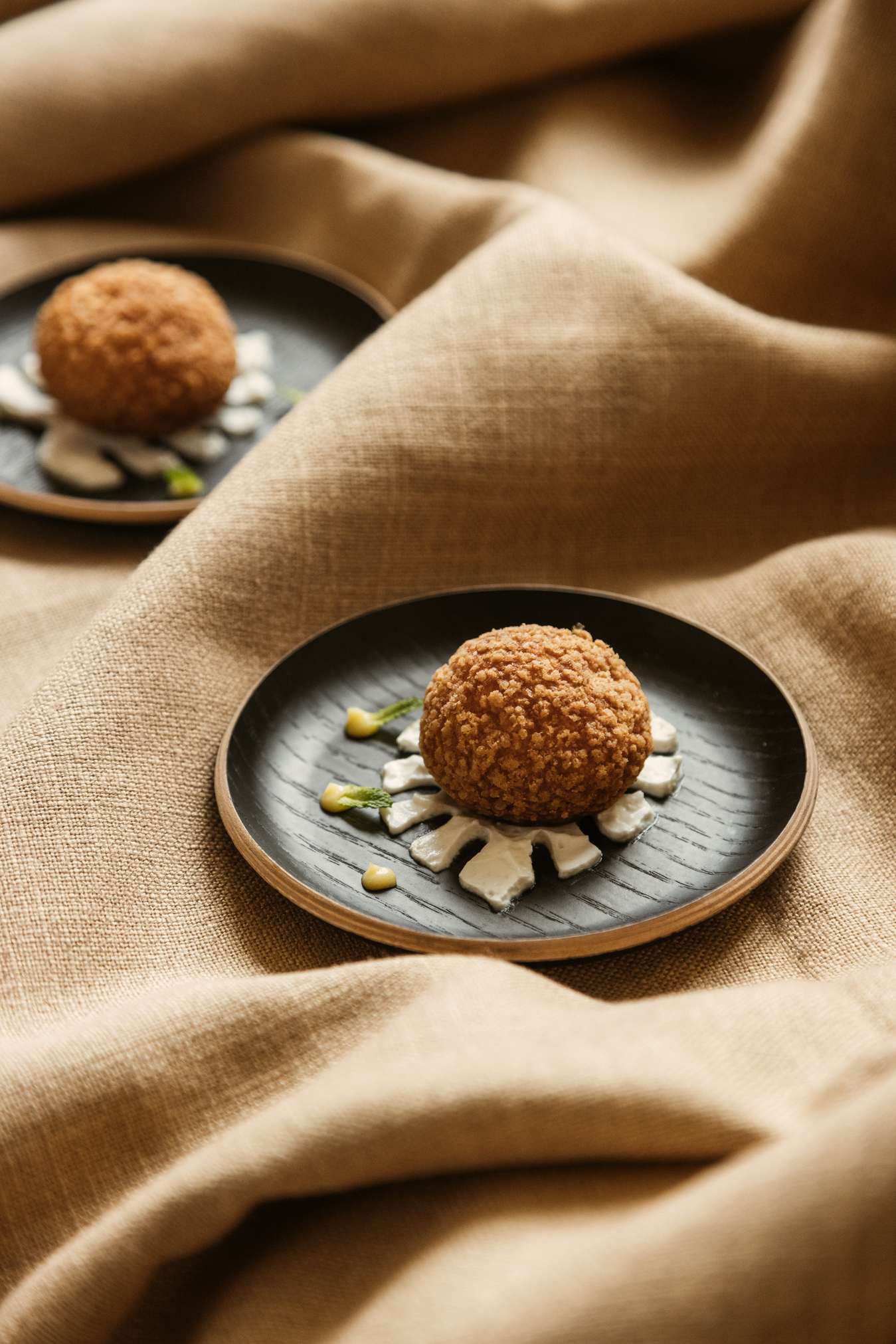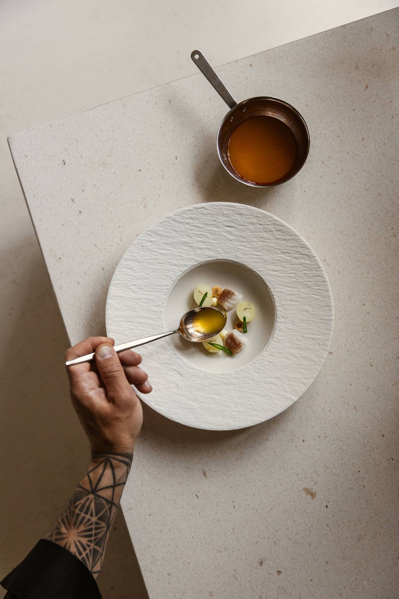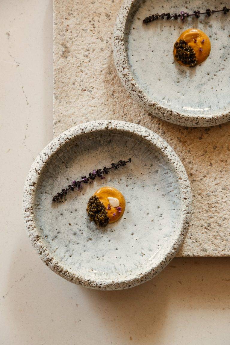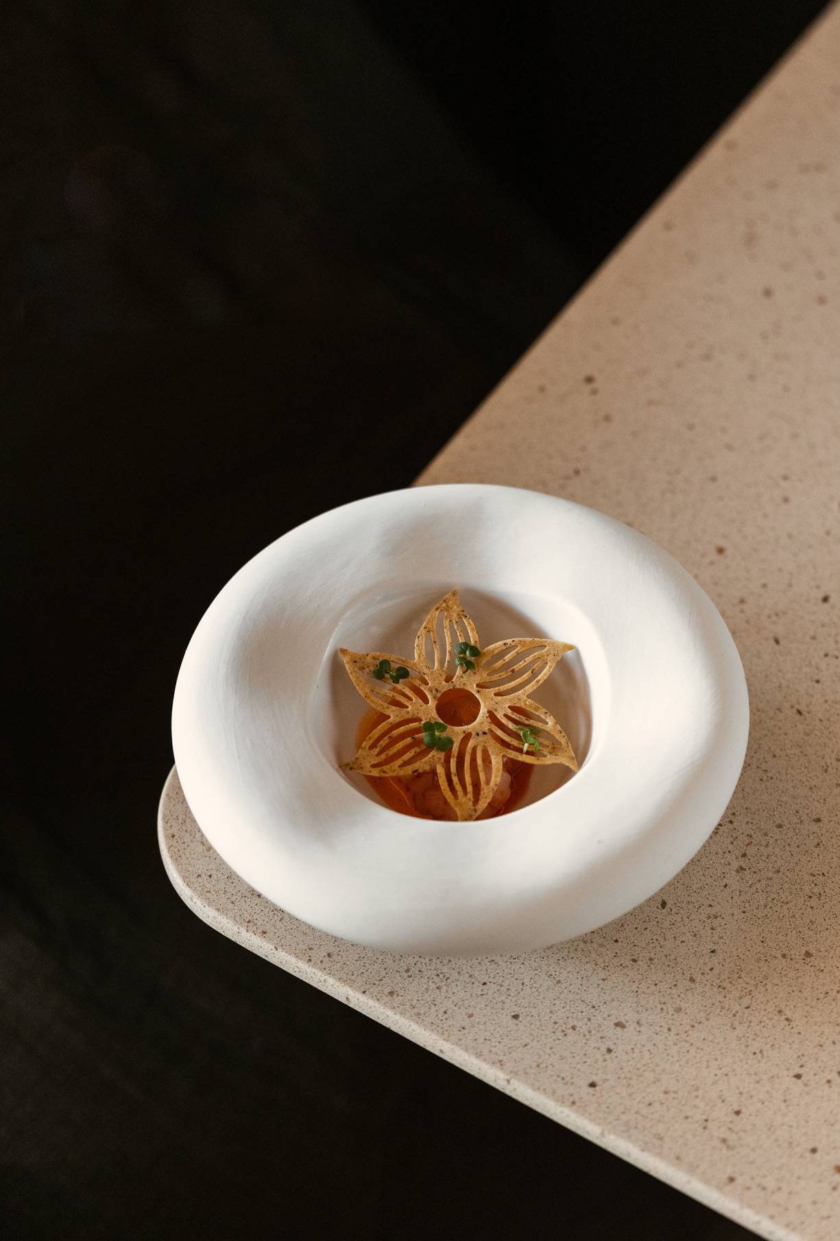 The restaurant’s interior is carefully curated to enhance the culinary experience with organic shapes, soft tones and natural materials creating a serene and inviting atmosphere. The presentation of each dish is a visual feast, with elegant plating that often incorporates edible flowers and ornaments, served on artisanal pottery. This meticulous attention to detail elevates each course, engaging all five senses and creating a lasting impression.