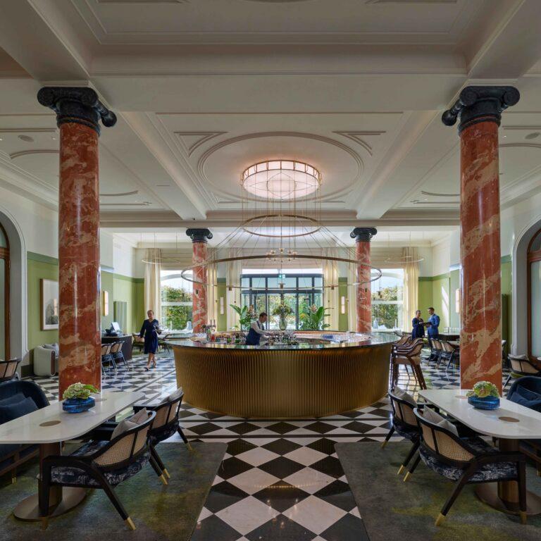 The renovation, overseen by local architects Iwan Bühler Architekten and London-based interior designers Jestico + Whiles, has resulted in an opulent destination that honours the building’s rich history. Mirroring the beauty of the surrounding Swiss landscape, the design merges modern furnishings with a natural palette of browns and blues that highlights the striking lake and mountain views.