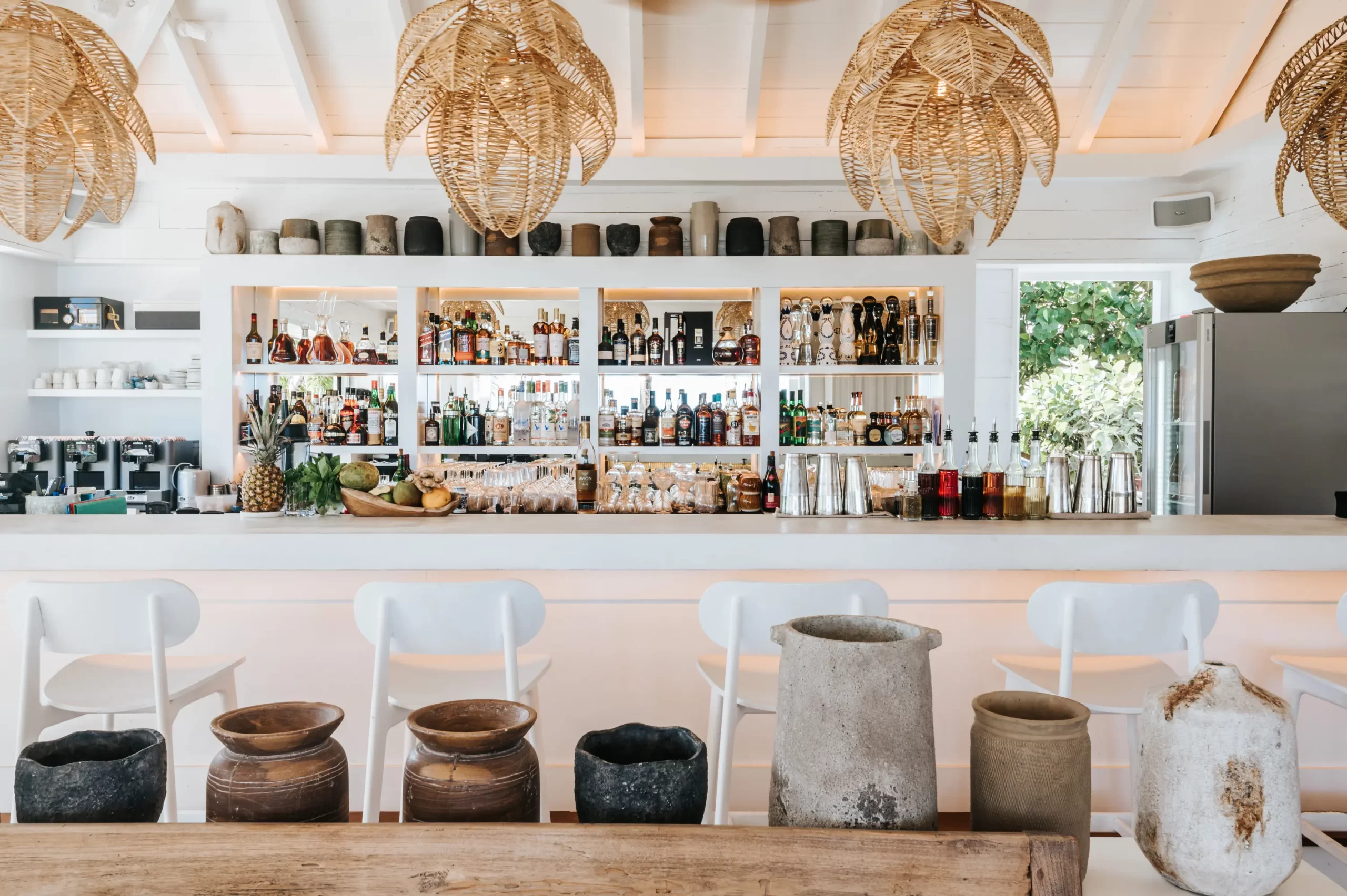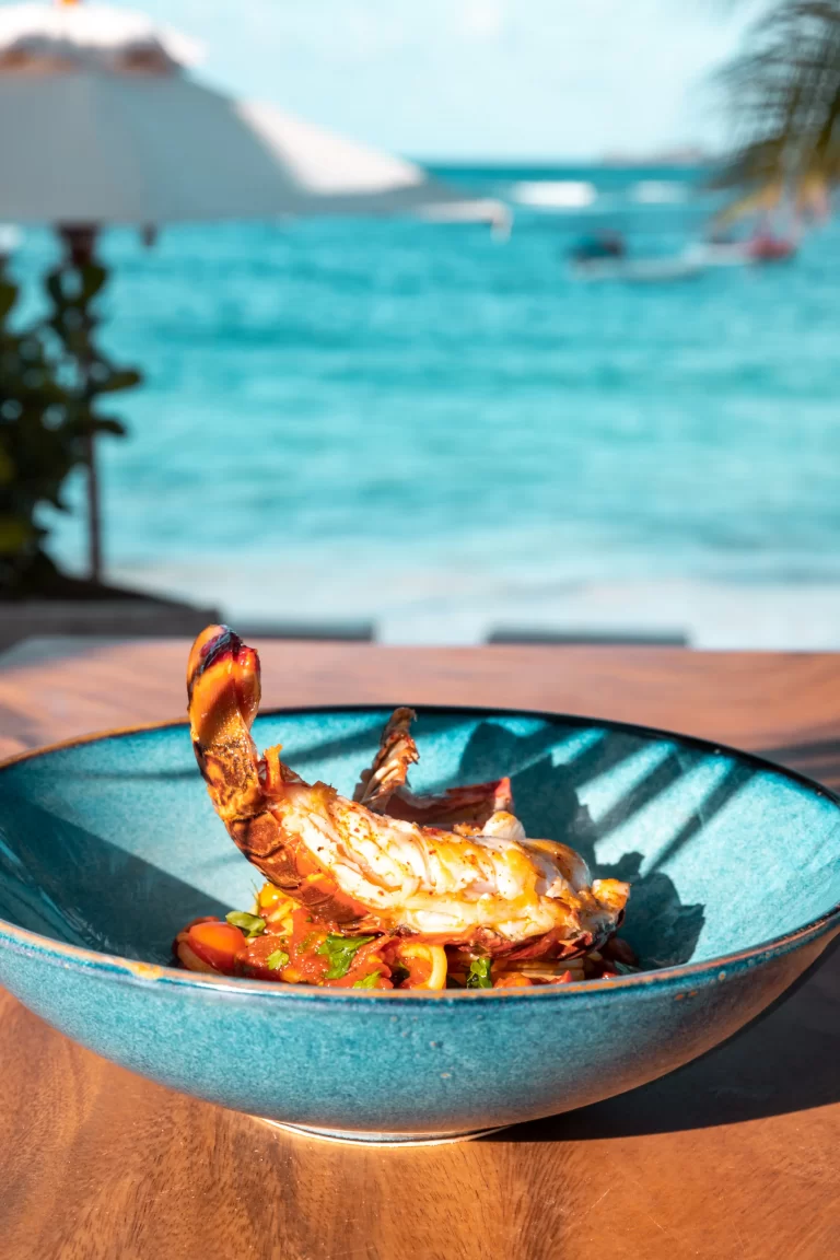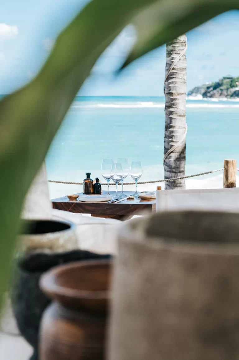 Nao’s l’art de vivre (Art of Living) philosophy is enshrined in the simple passion displayed in the aesthetic and menu. Taking a seat at the almost entirely open-air restaurant allows guests to feel ever connected to the crashing waves of the turquoise Caribbean Sea, with sand-touched flooring lending to the feelings of serenity Nao Beach inspires. Elegant and contemporary beach furniture, expertly curated in gentle tones of beige, Terre de Sienne, and terracotta, adorn the space. Tailor-made through French craftsmanship for Lelièvre and Elitis, the use of sustainable materials such as recycled fluted wood, tables made of certified wood, and furniture draped in artisanally weaved palm leaves supports the renewable resource mission of the island lifestyle and the clear respect Nao Beach Club has for nature.