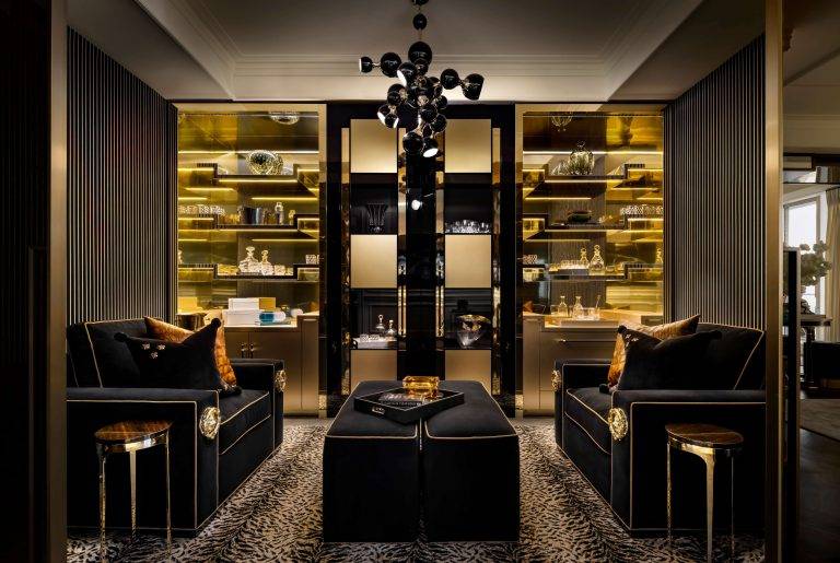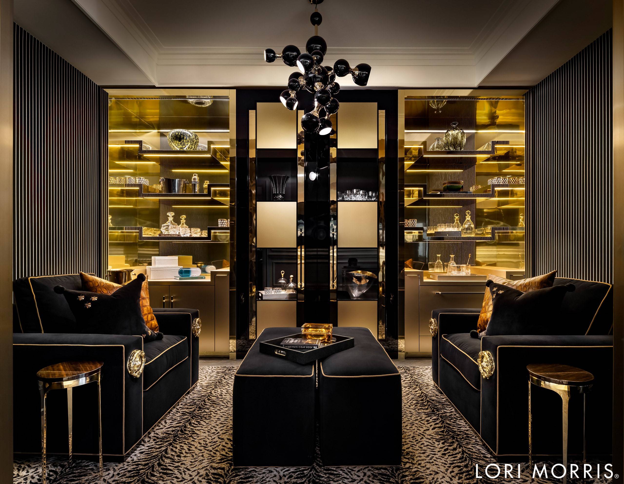 Every piece in the coveted Scotch room reflects the custom LMD luxe intensity, from the Art Deco-inspired cabinetry to the plush furniture and wall treatments. High gloss lacquer and brass cabinetry with mirror backing illuminate the space with a golden glow, offering a dramatic facade to showcase vintage treasures and cherished collectables.