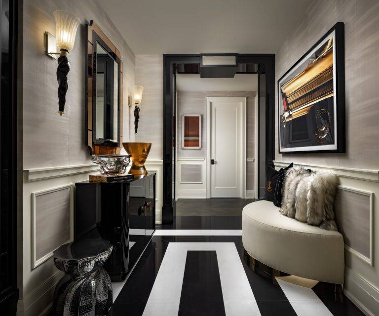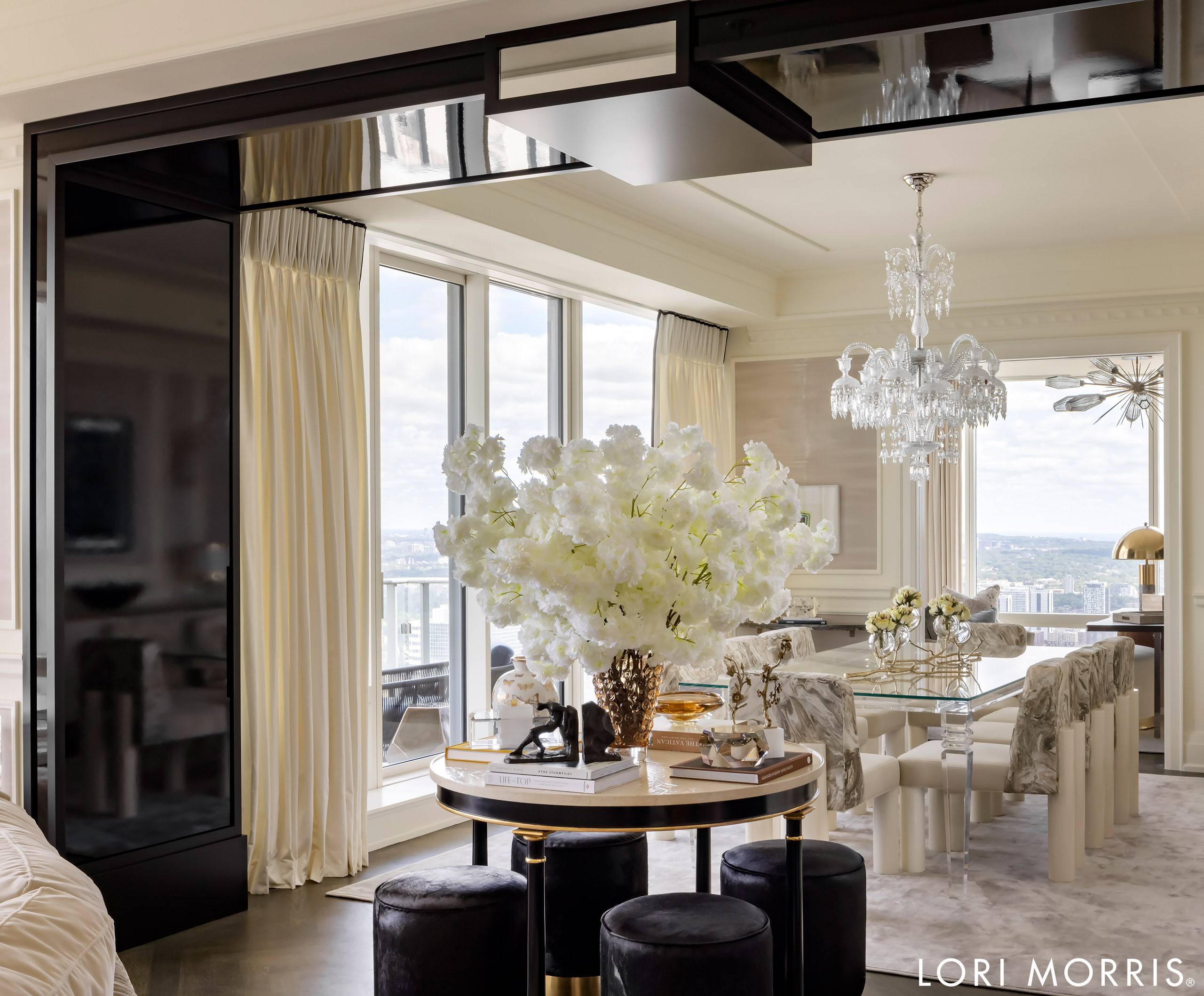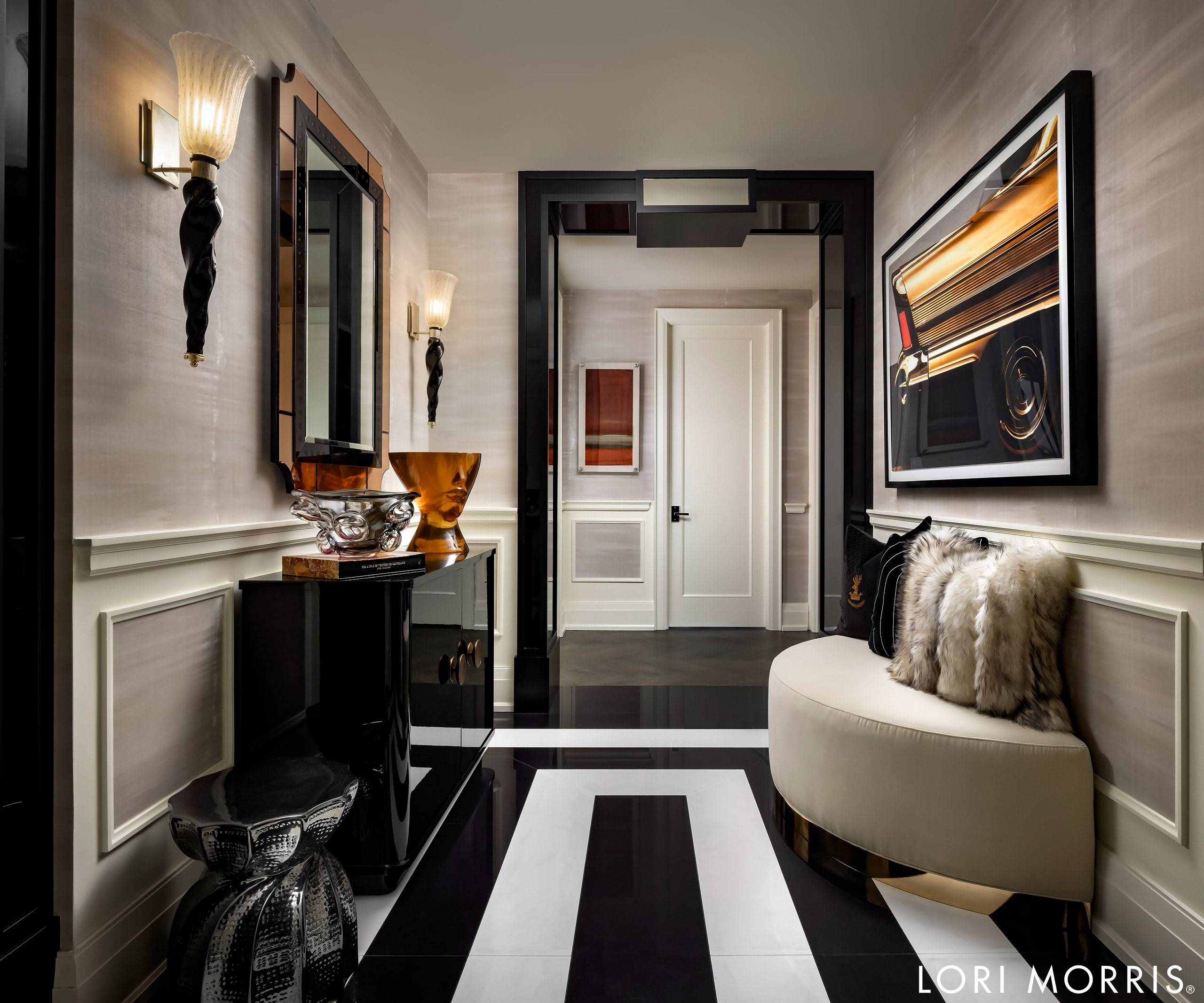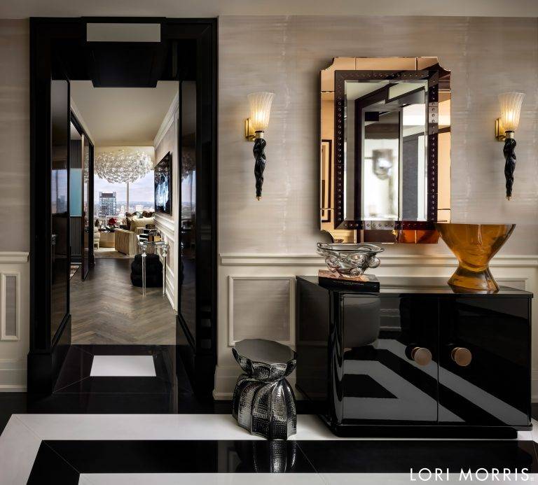 Titled Opulence in the Clouds, the residence welcomes in true Lori Morris style with a grand entrance that sets the stage for serious design posturing, combining classic architectural details with contemporary polish. A graphic black and white marble floor, amber hues, high gloss shine, and metallic accents elevate the luxurious integrity of this space, building anticipation for the magical LMD (Lori Morris Design) encounter that awaits.
