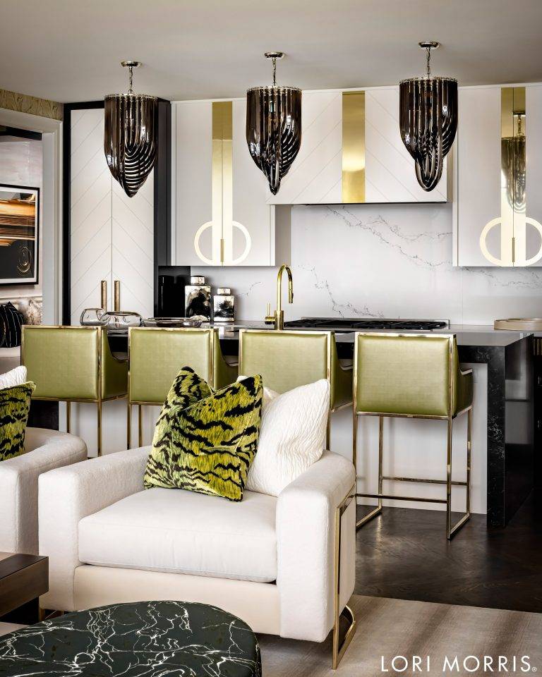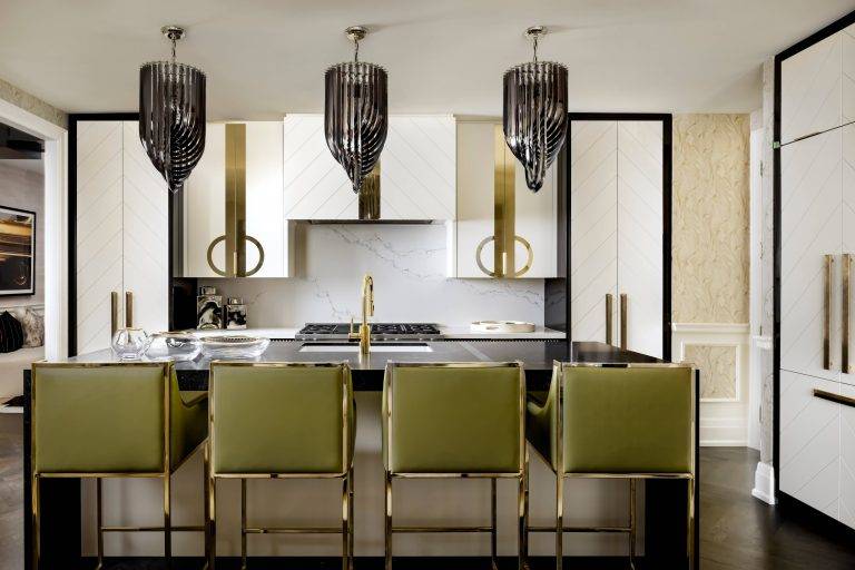 The elegance continues in the kitchen, where classic cream and black cabinetry is reimagined with chevron and brass design features, adding unique personality and glamorous appeal. An impressive marble-clad island stands as functional eye candy, while graceful brass chairs covered in mossy green leather add a punch of colour. Above, a rhythmic trio of light fixtures enhances the cosmopolitan feel of this sublime space.