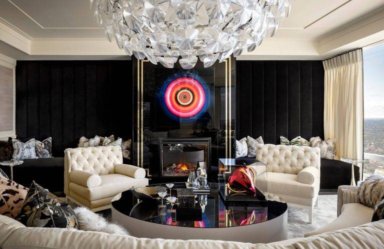 Moving through, the bespoke LMD living room epitomises elegance and sophistication, making it the ideal venue for entertaining and stimulating conversation. The sleek and chic room is dominated by a black and cream palette, creating a formal yet inviting ambience filled with a variety of contrasting accents and textures.