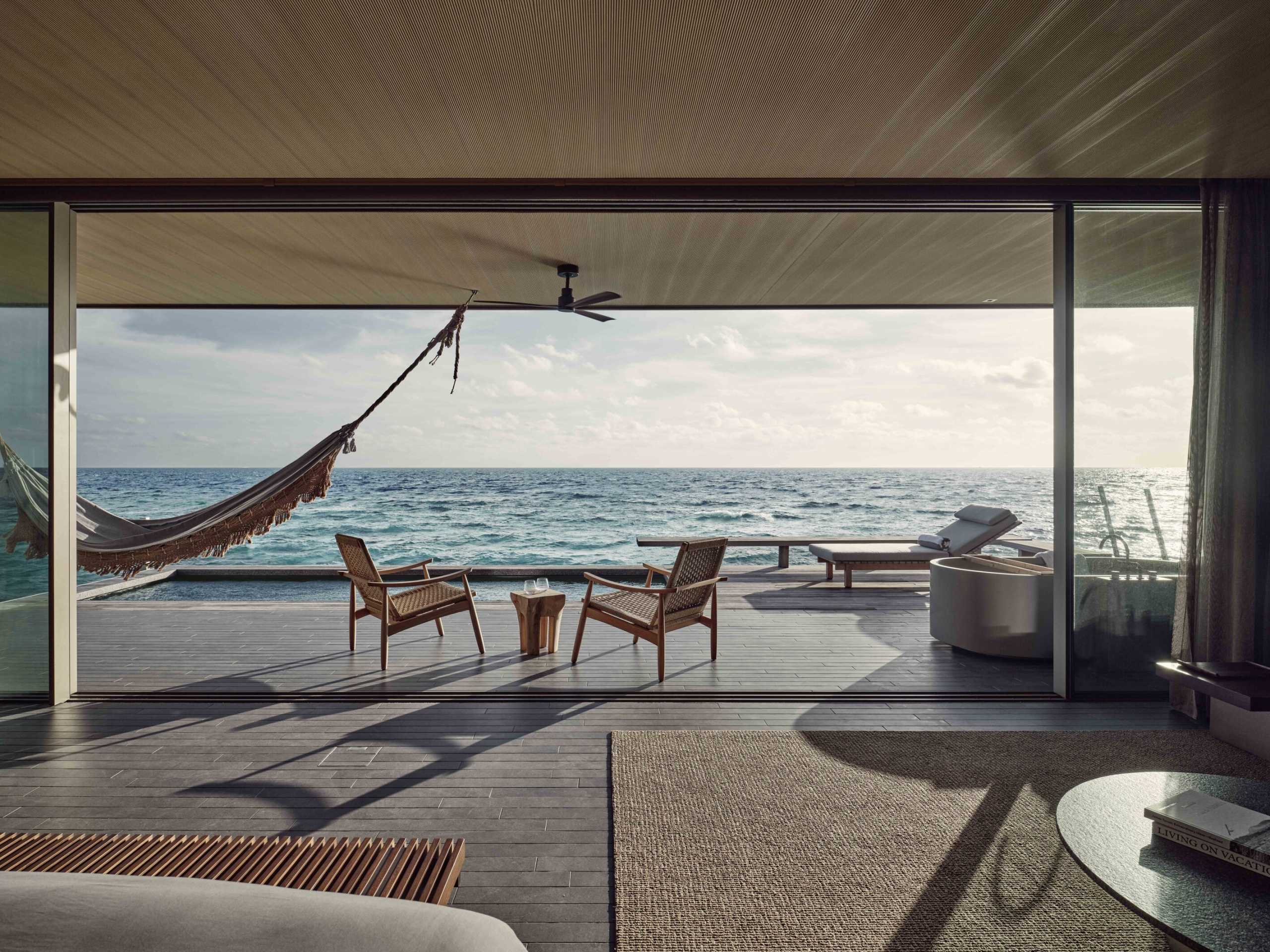 In terms of the interiors, this translates to stunning floor-to-ceiling doors that open up both the front and sides of the villa to reveal 180-degree views of Maldivian bliss. Simple yet effective methods of using the same quality materials inside and outside create a smooth transition between living spaces, which, coupled with chic designer furniture, makes for a truly stylish stay.