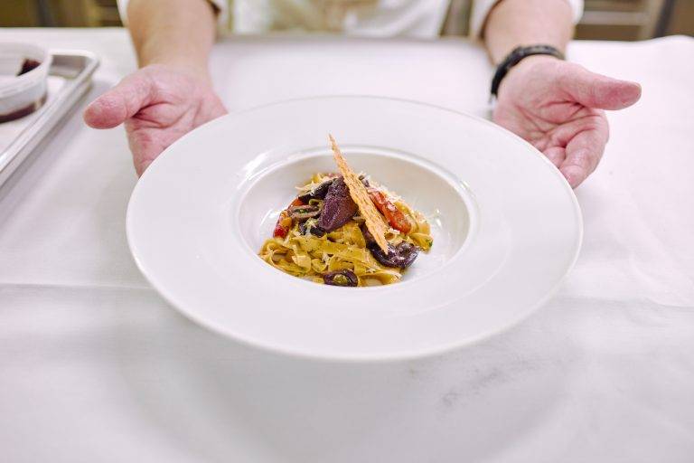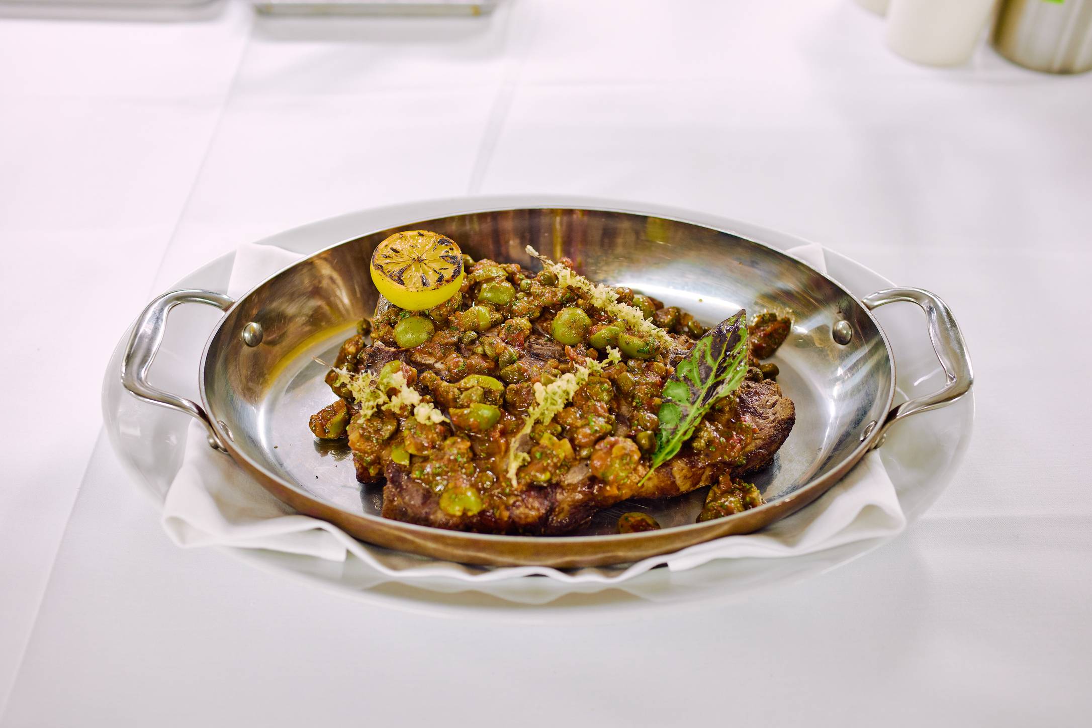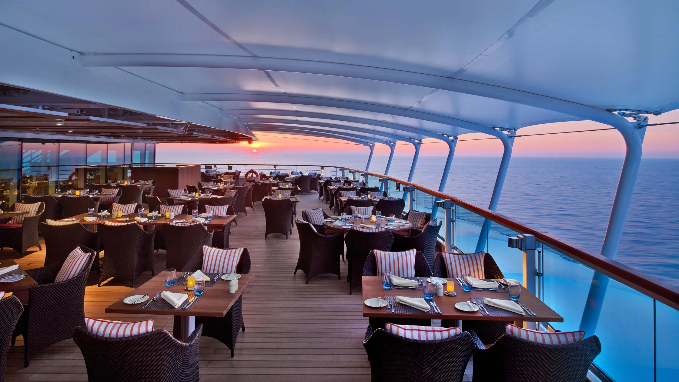 Then there’s Solis — the newest jewel in the ship’s culinary crown. Inspired by the Mediterranean and its glamorous rivieras, this stylish dining room is wrapped in floor-to-ceiling windows that frame the ever-changing sea, while dishes arrive like edible postcards from coastal villages bathed in sun and salt air. Starters include roasted shrimp crostini, tzatziki with crisp fried zucchini and eggplant, and a panzanella salad assembled tableside with sun-ripened Umbrian tomatoes and warm, just-baked bread.