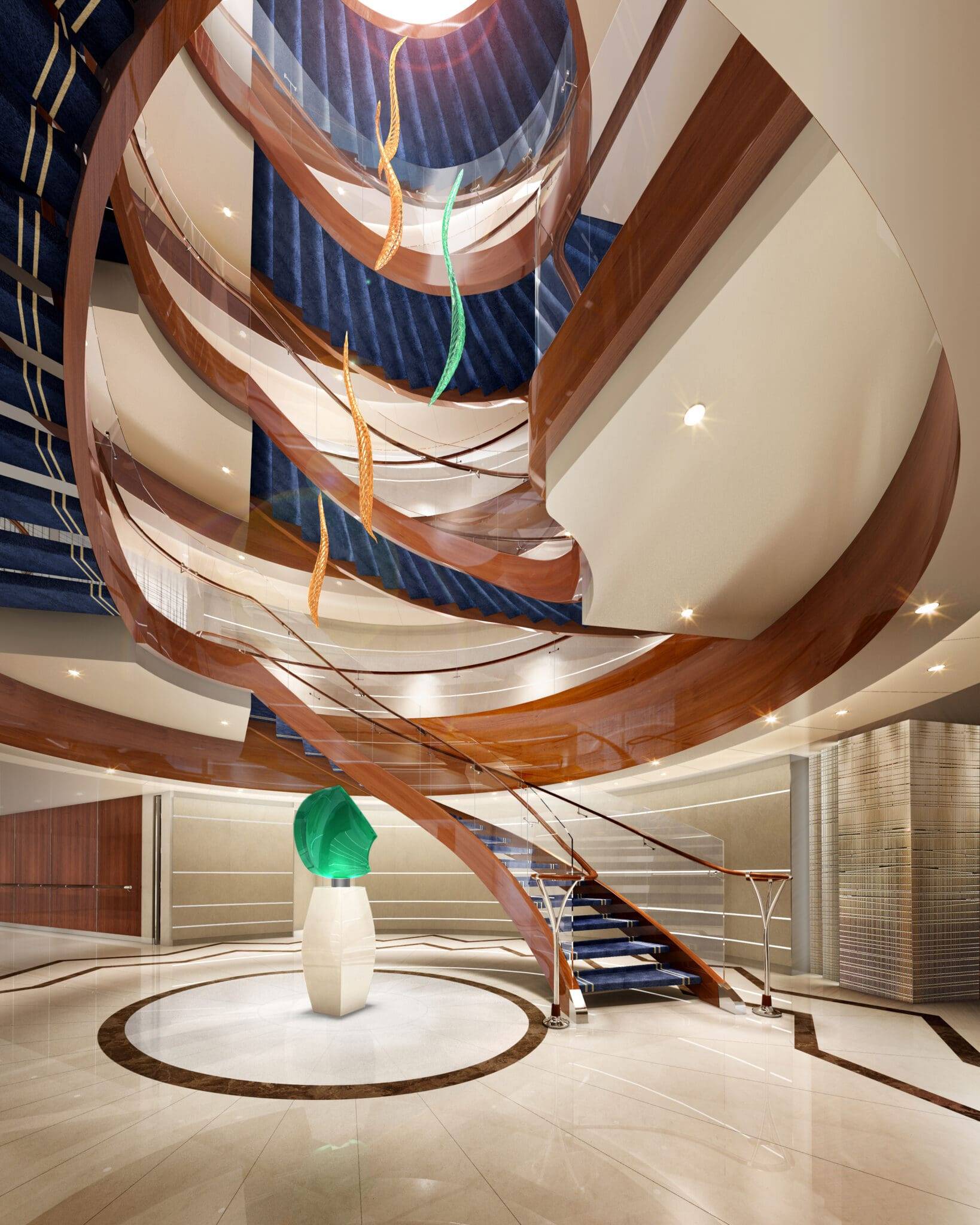 Like the service, the ship’s sleek interiors, designed by Adam D. Tihany, whisper rather than shout. There’s an understated elegance in the curved contours, the sculptural lighting and the warm earth-toned palette interspersed with blues as deep as the sea beneath Encore’s keel. You’re not on a cruise liner so much as inside a private club that just happens to float — light spills through walls of glass, bouncing off polished brass and smooth marble. The central atrium spirals upward like a silk ribbon, adorned with modern art that invites quiet admiration. Soft carpeting and gleaming wood lead you from stern to bow, revealing a ship that’s large enough to feel expansive yet intimate enough to feel known.