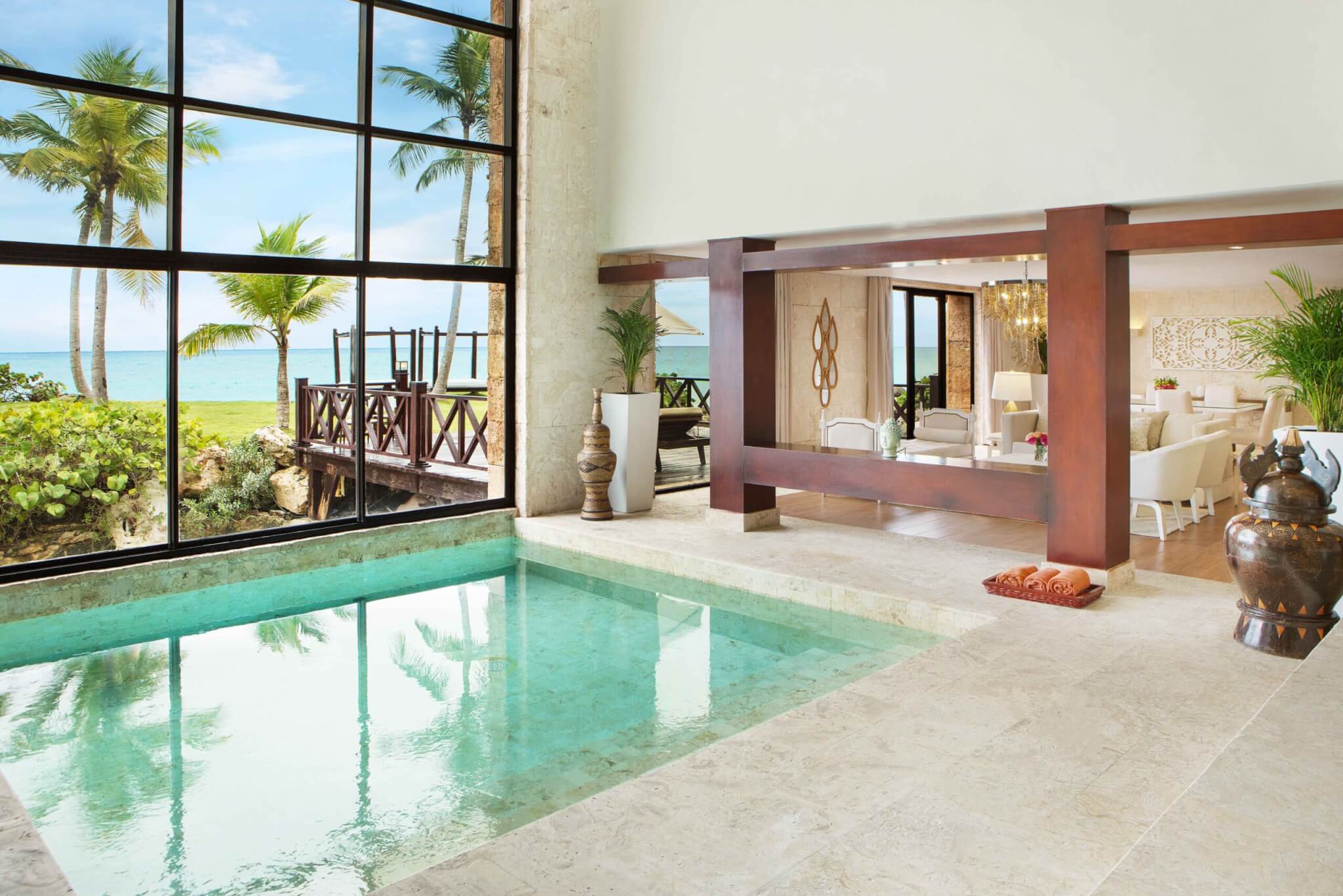 Sanctuary Cap Cana features 324 refined suites across its 19 unique room categories, including oceanfront luxury villas and private island suites with exquisitely furnished terraces and private pools overlooking the sea. Guest rooms present a design inspired by the timeless beauty of Europe’s Mediterranean coast. The grandest accommodation is the Castle Island Suite, a 5,500 sq ft two-level suite on a private island with a master bedroom, secondary bedroom, two and a half bathrooms, expansive living room, full dining room, and three indoor plunge pools with floor-to-ceiling windows showcasing infinite views of the Caribbean Sea.