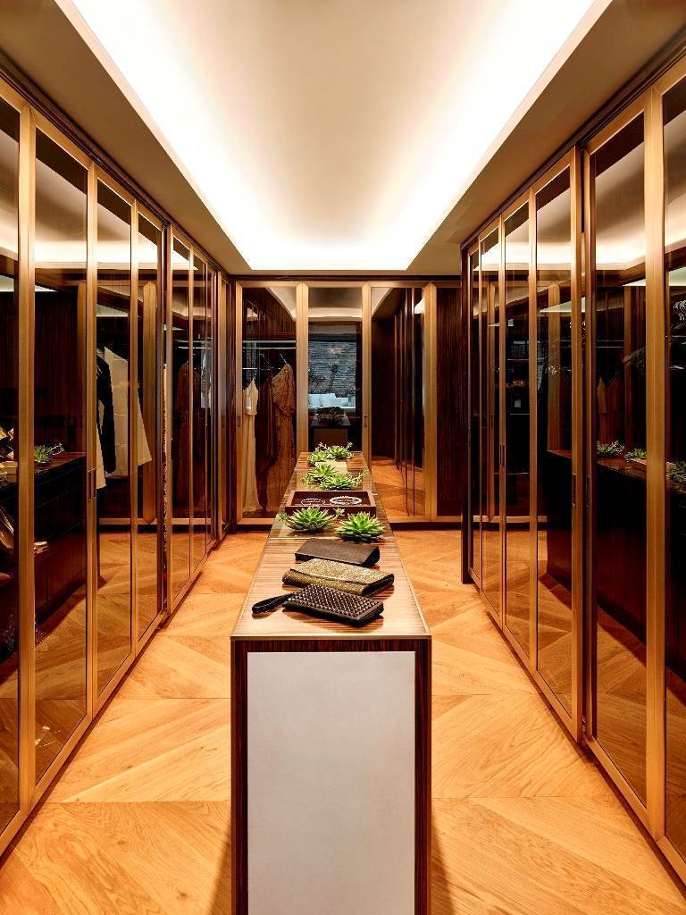 The magnificent main suite offers an impressive 40 square metres of space, all enrobed in dark tones and rich textiles. Its thoughtful layout creates an effortless flow between the indoors and out, with a secluded adjoining terrace furnished with comfortable lounge seating. Adding to its allure, the main suite boasts a 23-square-metre walk-in closet with a built-in safe and a 26-square-metre en-suite bathroom featuring a Greek marble steam bath, a bathtub embellished with shell mosaic, a separate rain shower and two wood-panelled washbasins with a broad mirrored front.