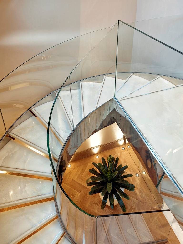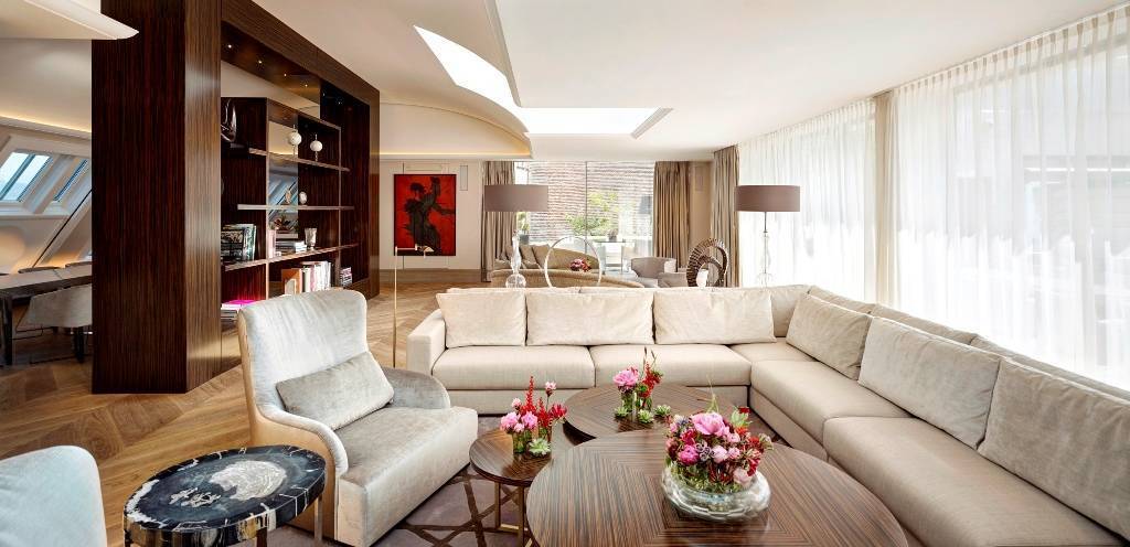 The suite also offers four furnished outdoor areas accessible via full-length sliding doors. The largest terrace is home to a striking natural stone dining table, serving as a beautiful alfresco venue for hosting meals with up to 10 friends or business partners. Adjustable blades and awnings provide protection from the wind or sun, while the integrated Bang & Olufsen sound system fills the air with convivial tunes from guests’ personal playlists. A natural stone staircase leads to the upper rooftop terrace, where visitors can relax on cosy lounge furniture surrounded by lush plants.