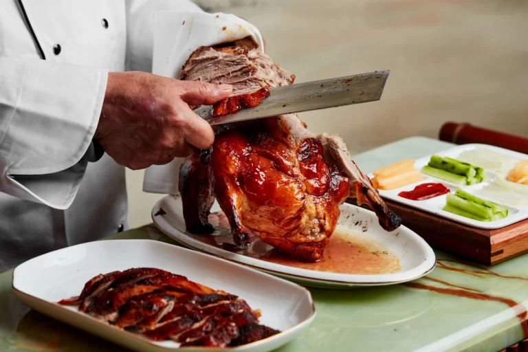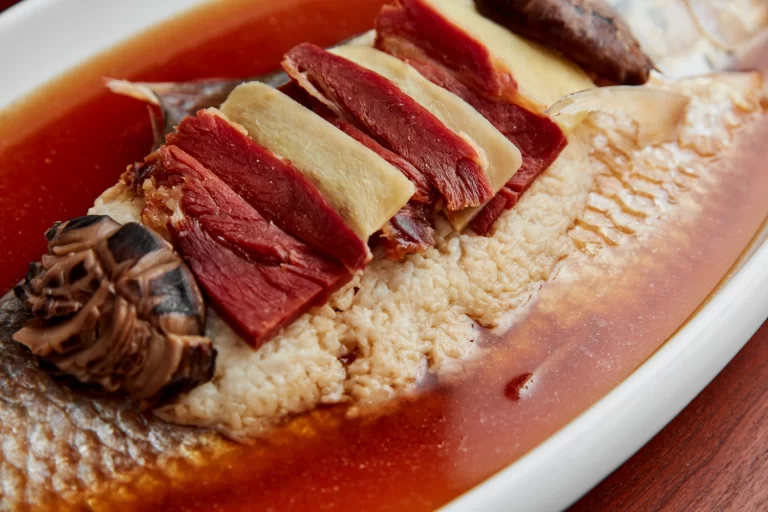 My current favourite dishes are the Deep-fried Mandarin Fish with Sweet & Sour Sauce and the Drunken Crab with 25-year Hua Diao Wine. These two dishes are very elaborate and complicated. We use 25-year-old Huadiao for its flavour and aroma. Deep-fried Mandarin Fish with Sweet & Sour Sauce is crispy on the outside and tender on the inside. It is a legendary dish in Jiangsu cuisine, one of the eight major cuisines in China. The boneless fish is cut into a cross shape before frying, sprinkled with shrimp, pine nuts, and green beans, and served in a slightly sour sweet and sour sauce.