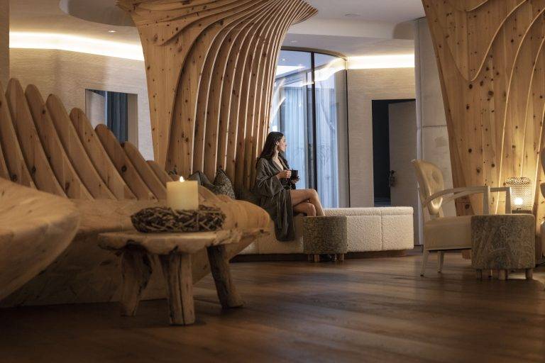 The experience reaches its most intimate dimension in the Private Spa, available on an exclusive-use basis. Here, guests can indulge in signature wellness rituals accompanied by a glass of champagne, whether choosing a cocooning treatment inspired by Ladin traditions—with whey serum from the family farm, handcrafted wooden tubs carved from juniper trunks and nourishing butter massages—or a detoxifying journey rooted in the essence of the Dolomites, combining sauna, mineral therapies, mountain spring water immersions and massages with phytotherapeutic oils.