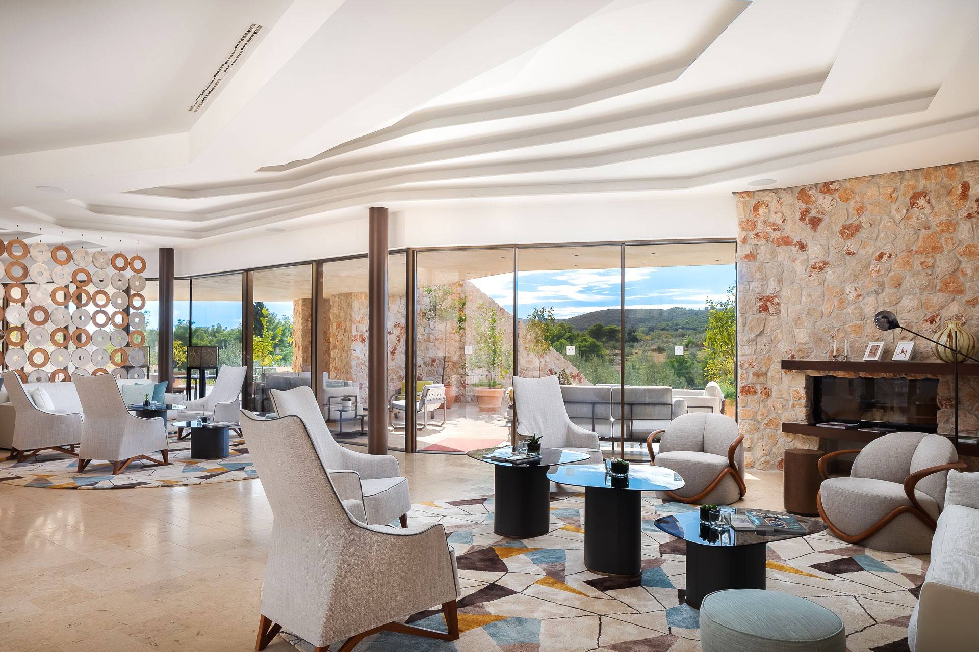 The bright and airy open-plan space integrates a lounge, bar and dining area, where floor-to-ceiling glass doors reveal vistas of sprawling olive groves and hills beyond. On a warm, sunny day, enjoying an alfresco breakfast at the adjoining terrace is just too good to resist.