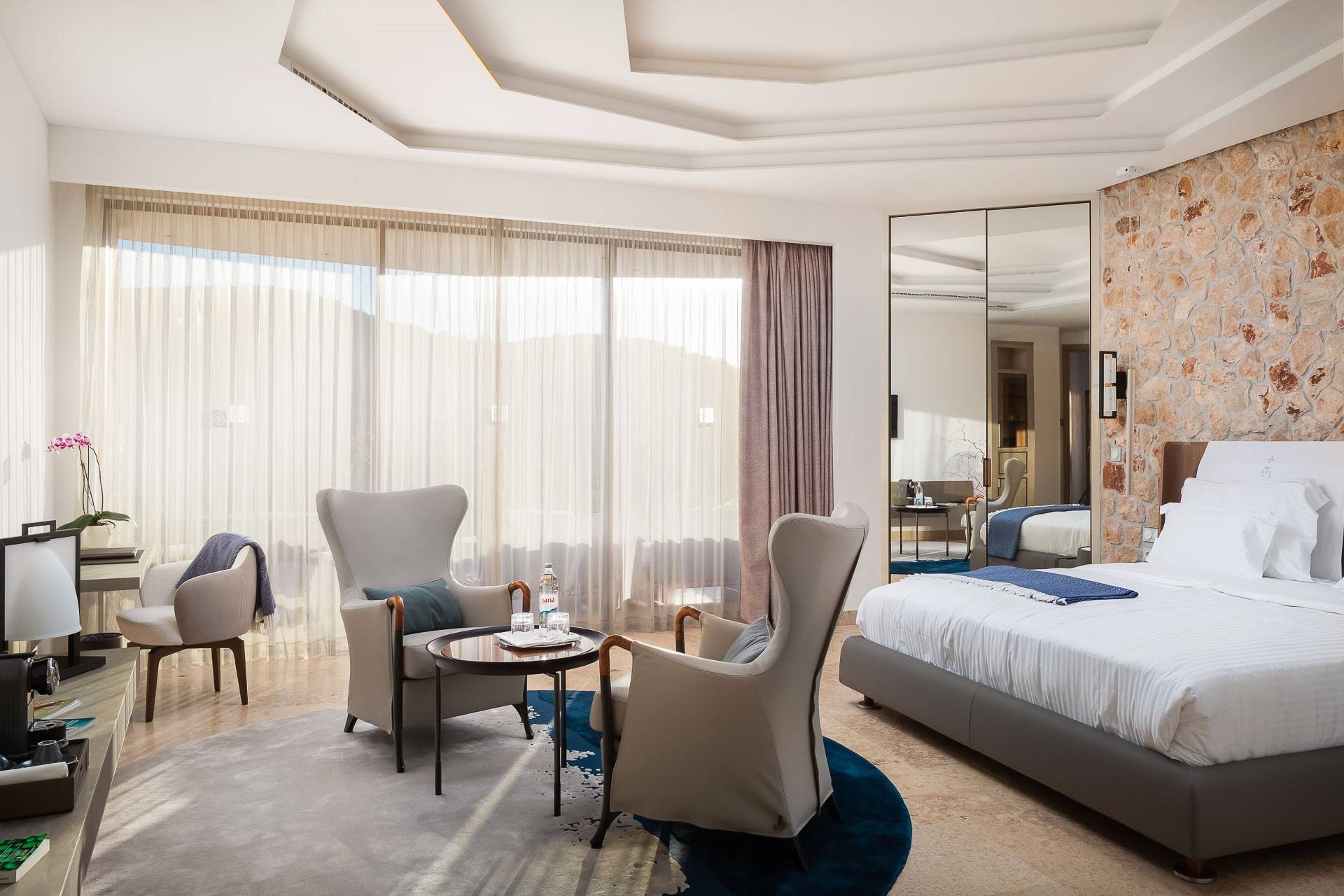 There are five individually styled deluxe rooms and three deluxe suites, each featuring a spacious terrace with private access to the olive groves. The last two rooms at the end of the villa have the best views of the sea and islands, and just a few yards away is a seawater infinity swimming pool that blends with the seascape.
