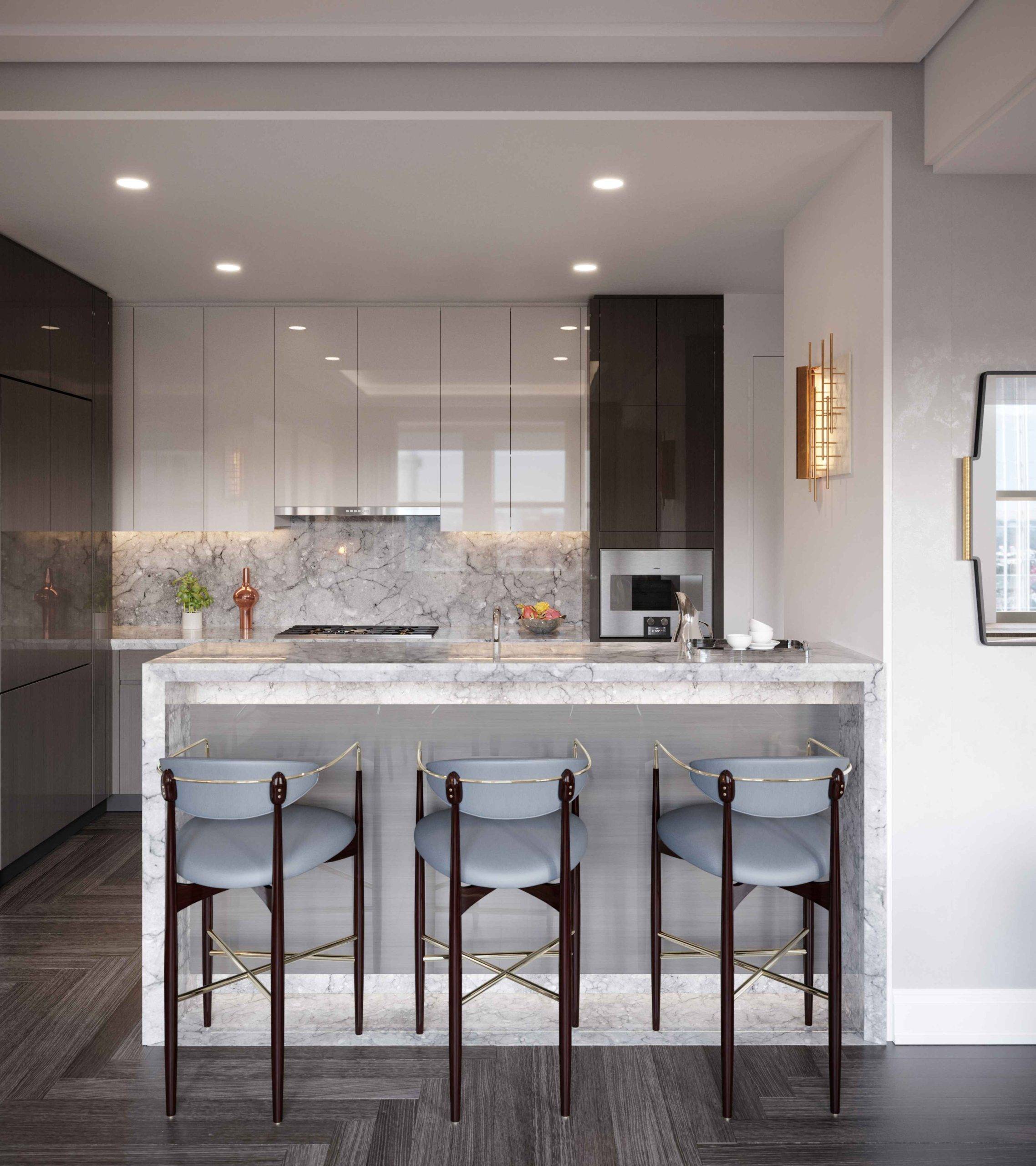 Internationally acclaimed designer Jean-Louis Deniot has meticulously crafted the sophisticated residential interiors and amenities, blending modern elements within the building’s historic Art Deco design. From studios to opulent penthouses, each residence boasts custom features, including solid custom-paneled interior doors with bespoke antique bronze hardware, Italian-manufactured custom cabinets by Molteni&C, and vanities with polished marble countertops. Every residence has also been outfitted with all-new windows featuring modern sound-attenuating technology while paying homage to the original 1931 design, and herringbone floors with a custom cerused finish. To top it off, residence kitchens come complete with a full suite of integrated state-of-the-art Gaggenau appliances.
