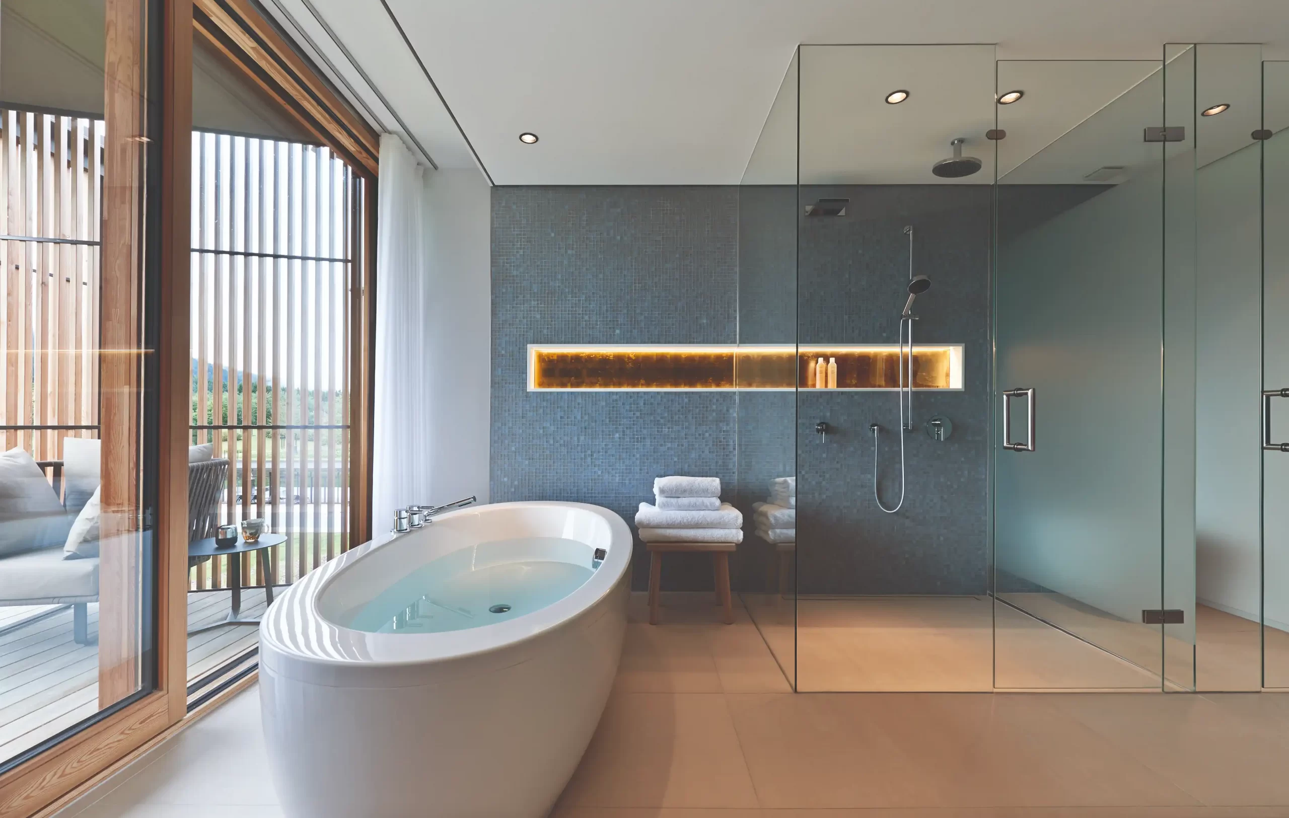 Inspired by the idea of creating a ‘high-tech monastery’, architect Christoph Ingenhoven and landscape architect Enzo Enea designed the building in harmony with its tranquil surrounds. Luxurious yet evoking a sense of calm, the large spaces and minimalist decor create the most beautiful healing environment. Each of the 70 expansive rooms and suites come complete with a terrace balcony and floor-to-ceiling windows. The property is also home to a spa, outdoor heated saltwater pool and separate bathhouse with saunas, an indoor pool, a therapeutic cold chamber and an exercise and yoga room, all with views across the Tegernsee Valley.