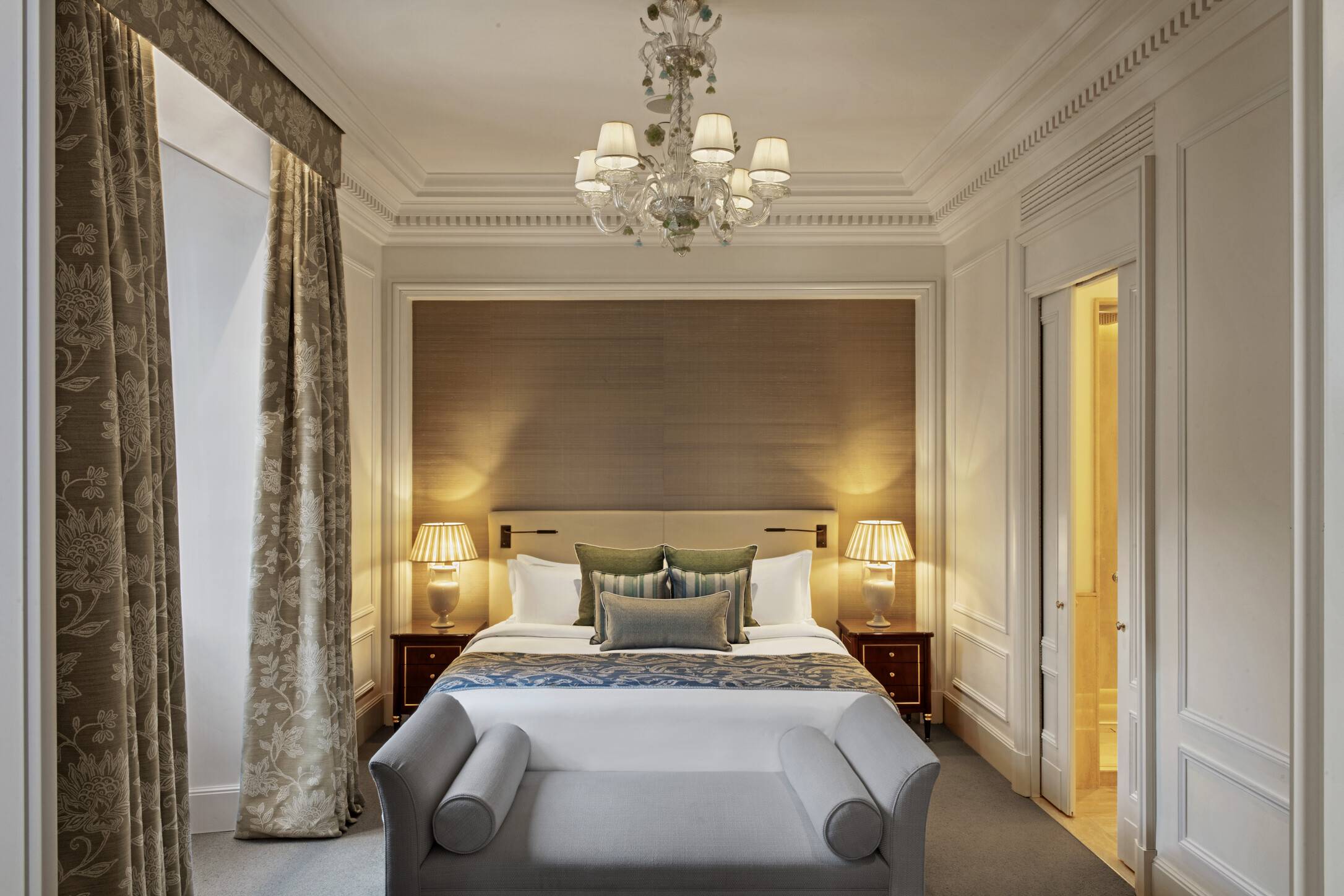 Originally opened by the legendary César Ritz, this storied palazzo, renowned as the city’s first deluxe hotel, has welcomed guests since 1894. Today, after a meticulous multi-million-euro renovation led by Pierre-Yves Rochon, it still wears its history like a well-cut jacket—tailored and suave, but woven together with a modern thread. Think Regency and Louis XV motifs softened by sleek architectural lines, travertine underfoot, Venetian chandeliers overhead, and a palette that softly references Rome: powder blue like the sky beyond the Quirinale, terracotta like the sunset over Trastevere. Nothing here is overly polished or performative. Instead, there is a quiet confidence in the way past and present coexist—Roman busts and contemporary art, Empire-era furnishings and curated objets d’art, all balanced in serene composition.