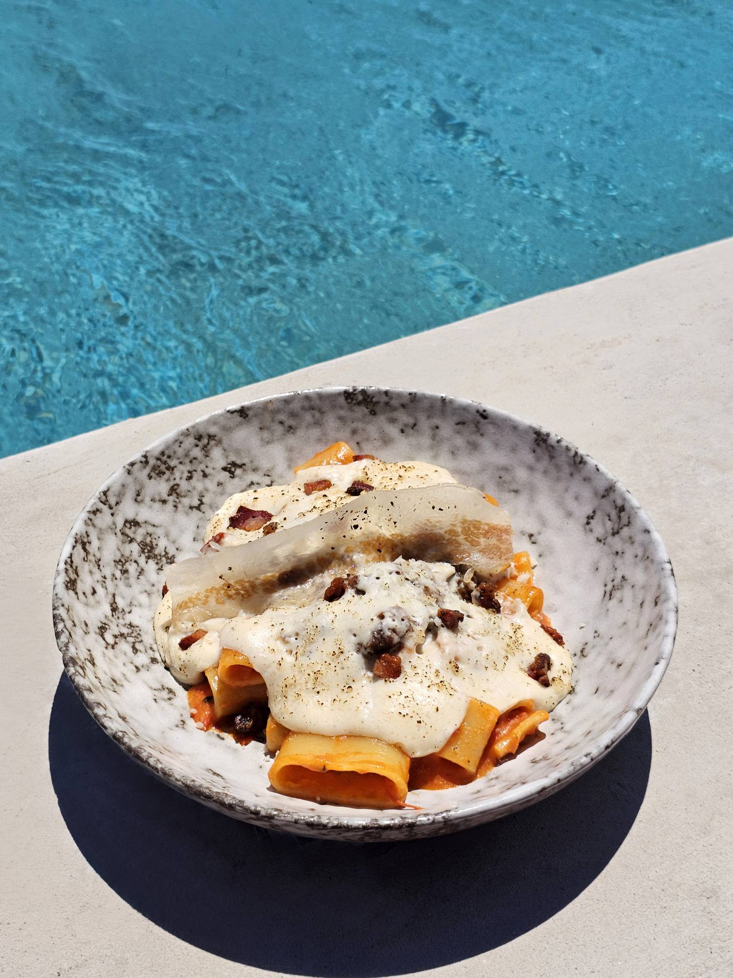 - Place the pasta in a deep plate, top with the cheeks and sauce, and finish with the béchamel foam.