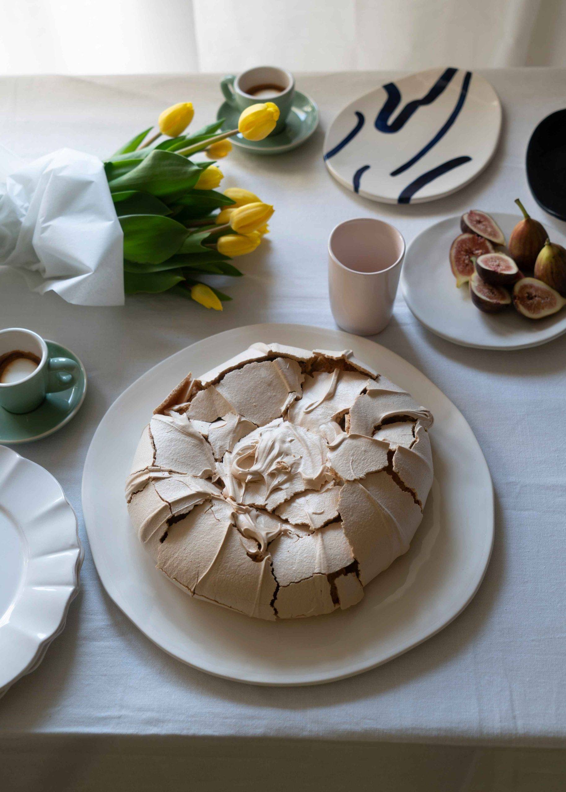 - Place the meringue on a pretty platter and top it with whipped cream or mascarpone, figs and nuts, and drizzle it with a little honey.
