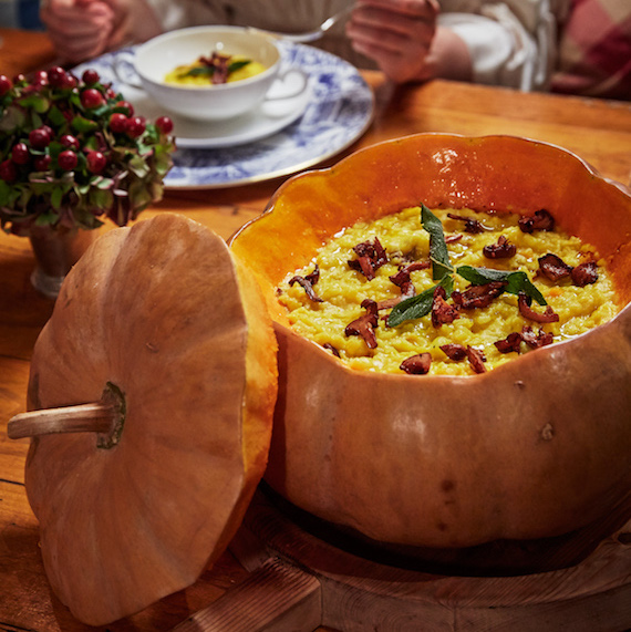 In this recipe, the addition of seasonal pumpkin enhances the velvety texture of the risotto, while the addition of Virginia apples and toasted pecans brings