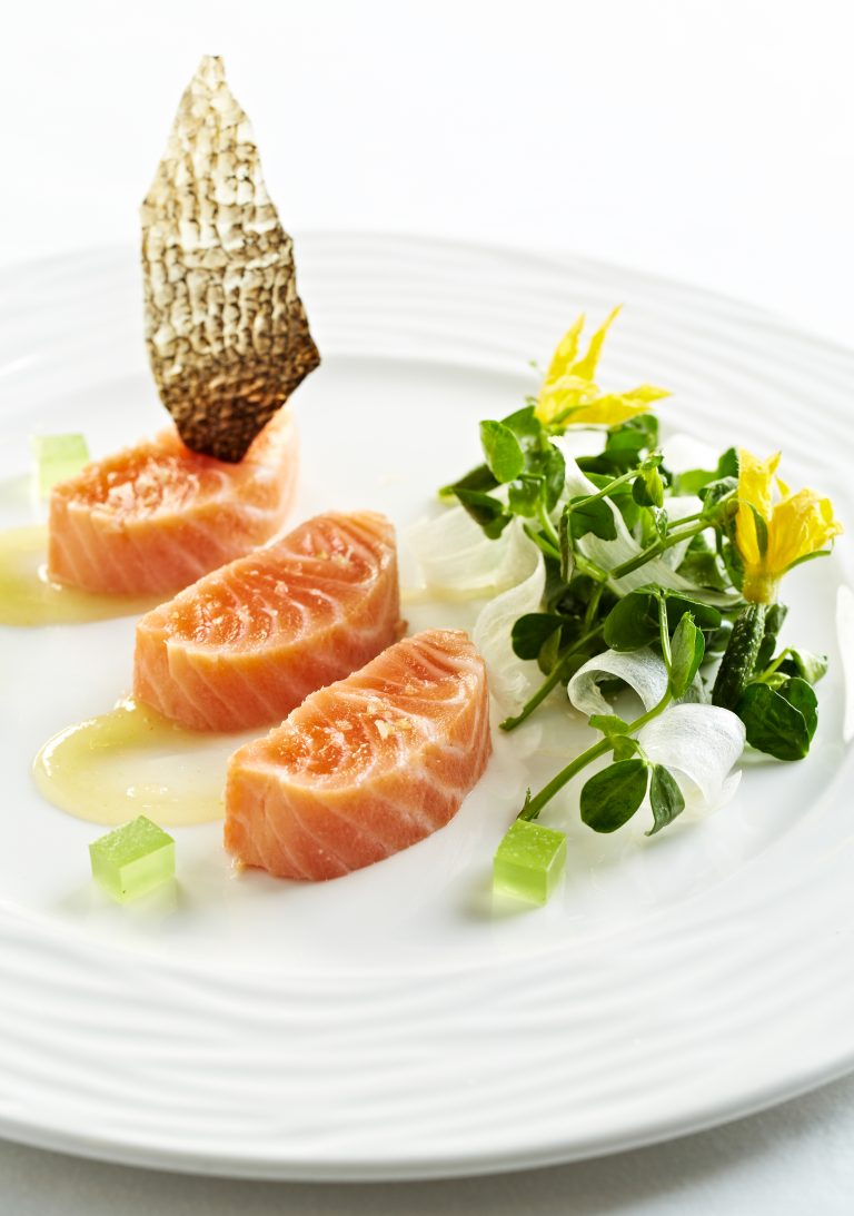 Silky Asian-cured salmon with a punch of flavor from vodka jelly, a delicious dish from Rachel Humphrey of 2 Michelin-starred Le Gavroche.