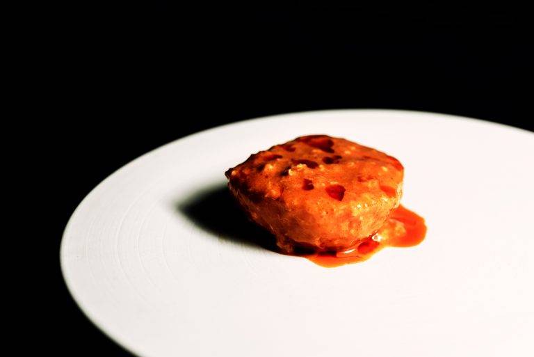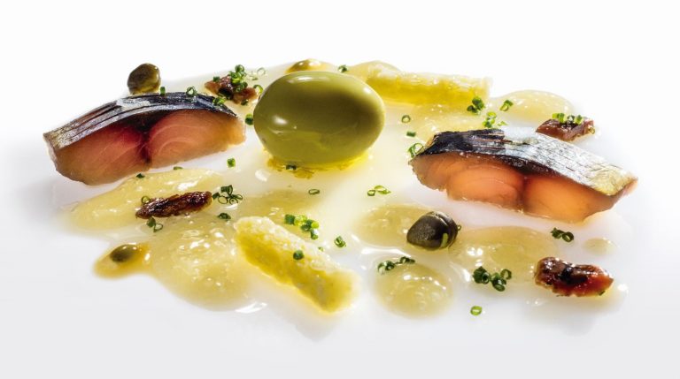 A dish featuring olives and mackerel, this is one of chefs Mateu Casañas, Oriol Castro & Eduard Xatruch’s prized creations on their menu at 2