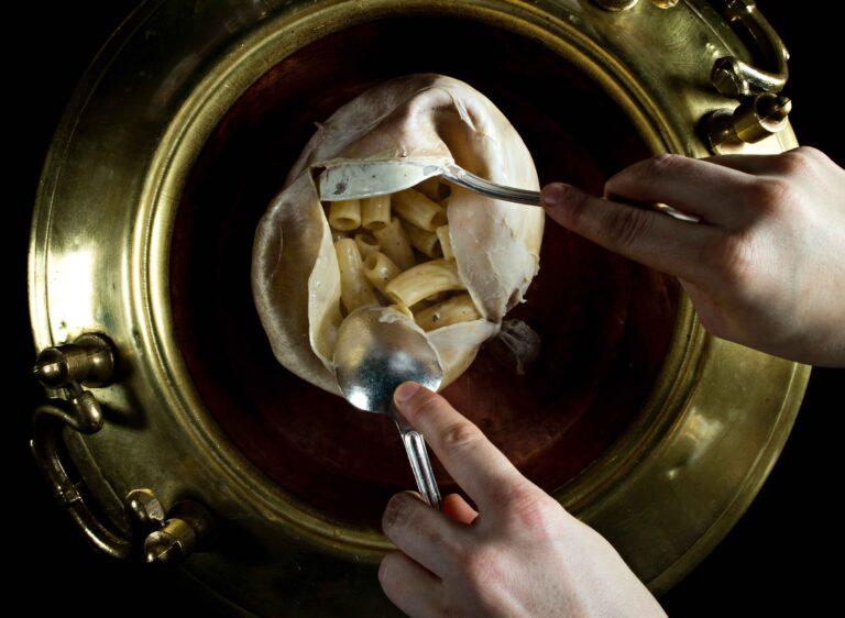 - Serve in front of guests by cutting open the bladder with a sharp knife and spooning the rigatoni onto plates.
