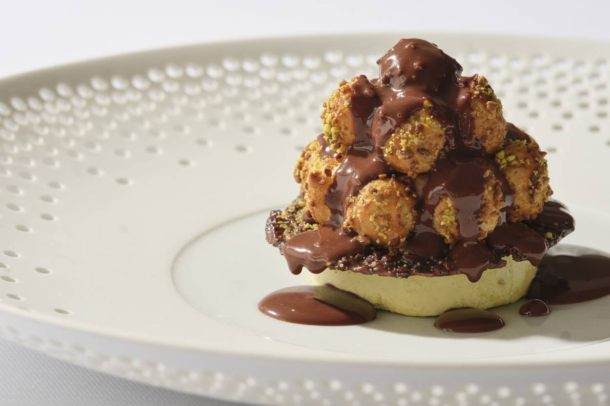 Dessert brings a signature finale: profiteroles filled with chocolate cream and pistachio, taken directly from L’Olivo Capri’s dessert repertoire and created by world-renowned pastry chef Pierre Hermé—a detail that underscores the residency’s commitment to both pedigree and precision.