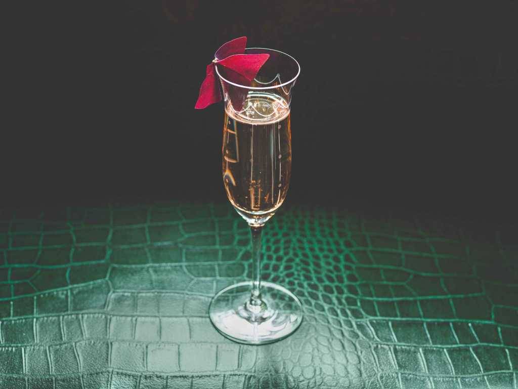 50ml Suntory Roku gin and Haku vodka infused with raspberry and strawberry oil; 5ml sakura (cherry blossom) distillate; 5ml Concord 8 vinegar; 45ml Laurent Perrier champagne.